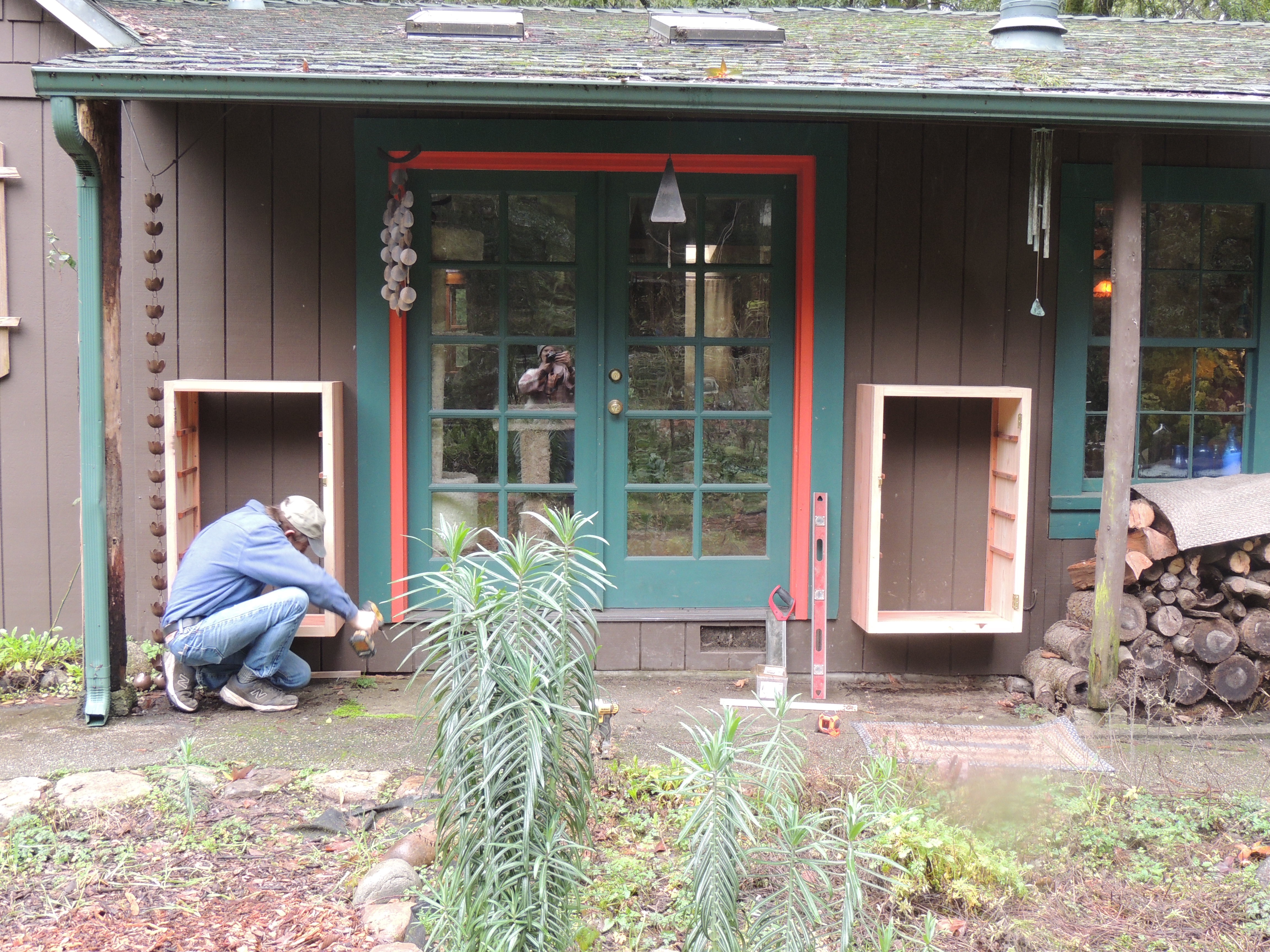 Rich Wilhelmsson installiing custom redwood shoe boxes he made for us.