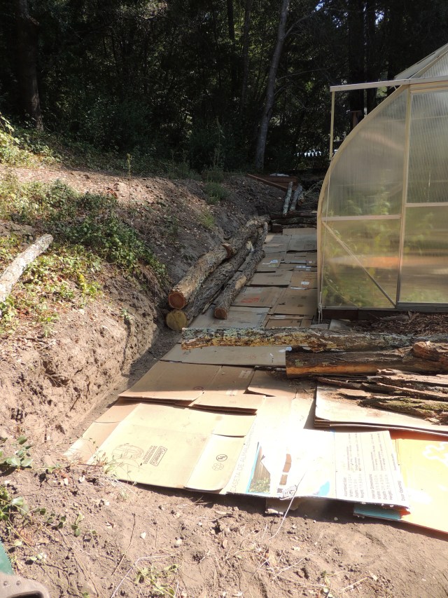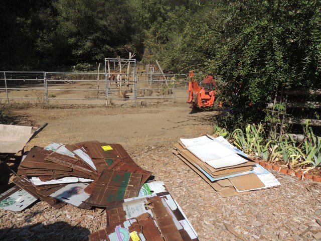 It’s been a few months of collecting cardboard for sheet mulching, and today was the day for digging out a sidewall of dirt around the horse corral and moving a big pile of wood chips.