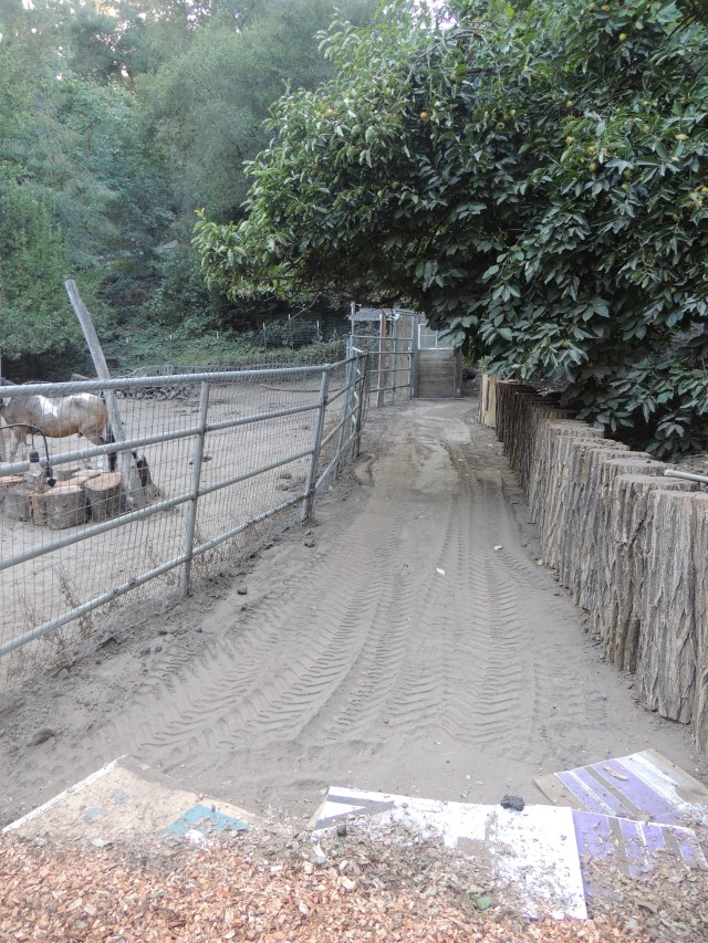 The goal for this smoothed space is to not use cardboard sheet mulching, but instead lay down redwood mill scraps as the base and then coat with wood chips. Now, it’s easy access to wheelbarrow the horse manure compost into the garden.