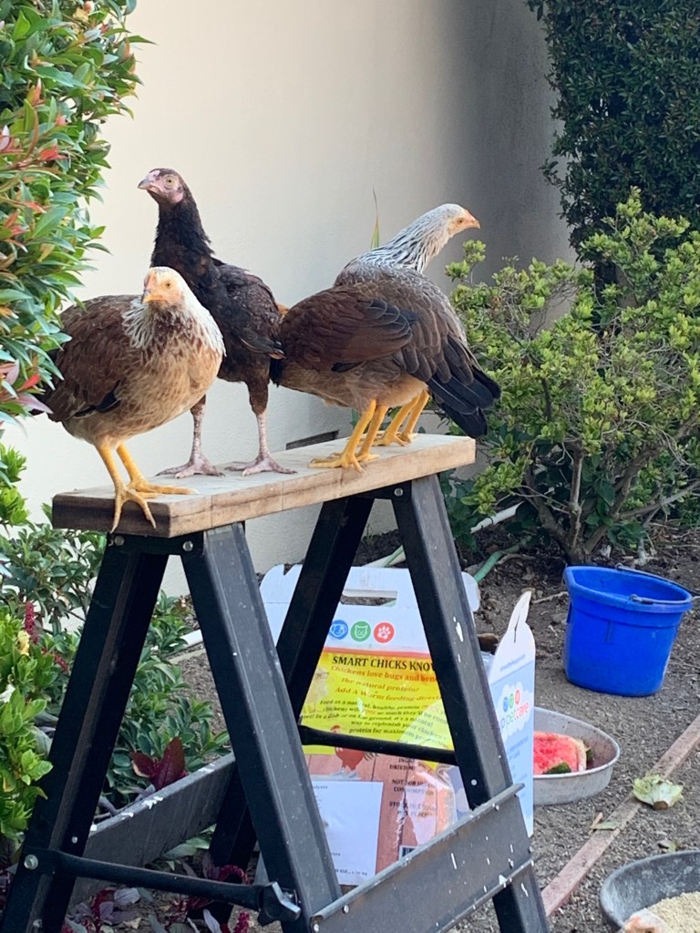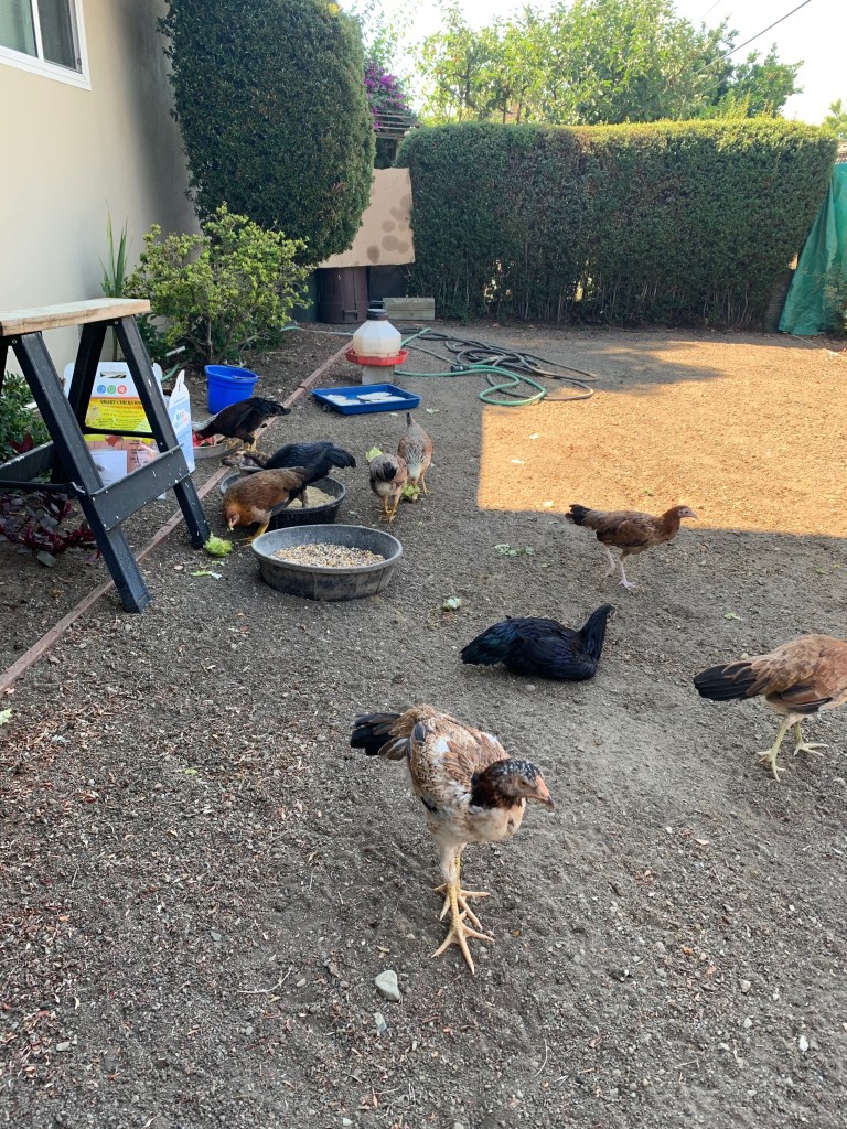 At 1:15 a.m. we arrived at my parents house in Sunnyvale with 2 cats and 15 chickens. They were very accommodating and gracious to let us stay for 10 days. The chickens had a ball in their backyard, free ranging. At night, we would put them in the garage in crates. The neighbors brought over their two young children for a visit.
