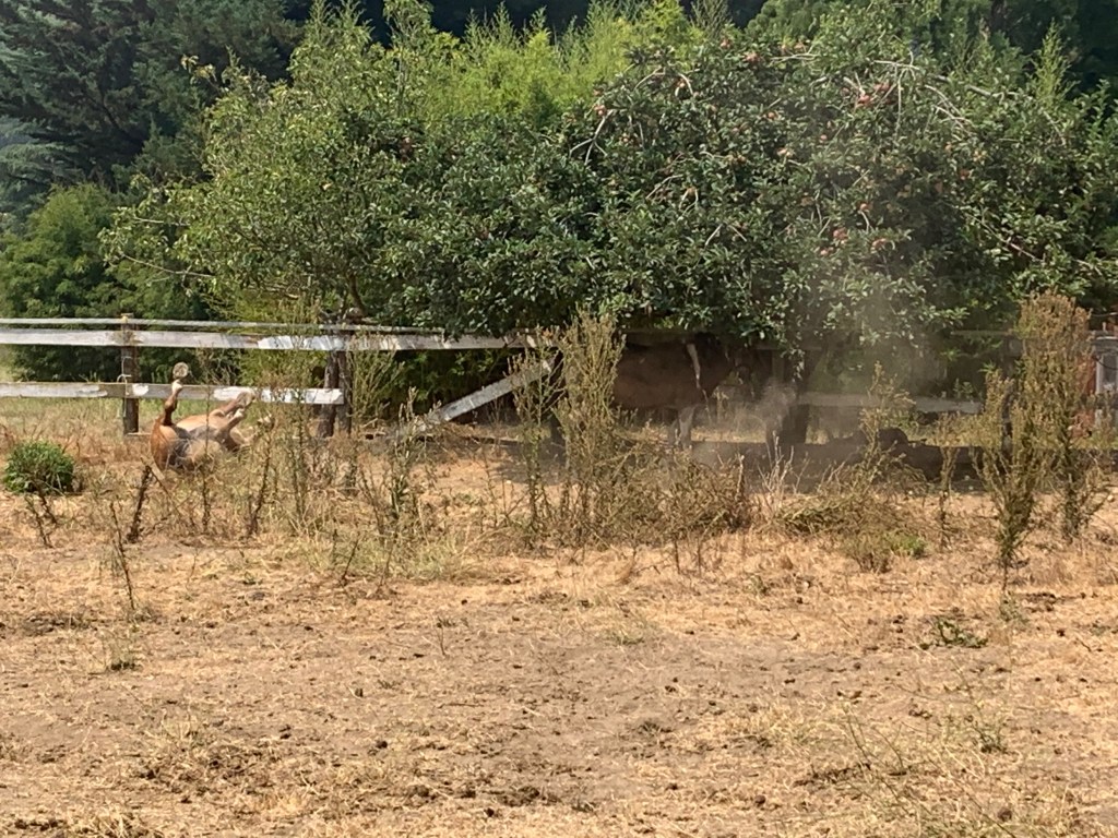 The horses immediately relaxed and became horses again, meaning that they could roam the field, smell the grass, and roll in the dirt. Also, Shasta immediately found the apples and parked himself under the shady apple tree, just like home!