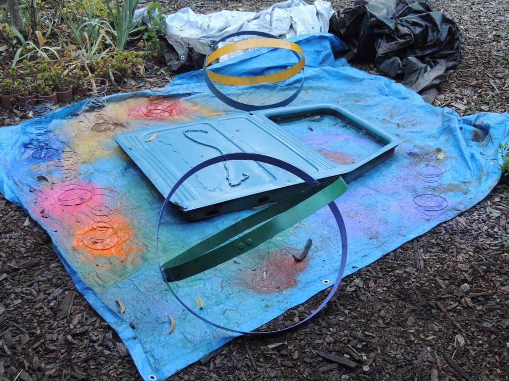 Fun art project completed for back of the redwood grove that faces our deck. I can also see it out the kitchen window. I had 3 kid’s bike frames I had wanted to use for the dragonfly gong, and a jeep door I thought about using for the farm fence. These leftovers turned out perfect for this whimsical space.