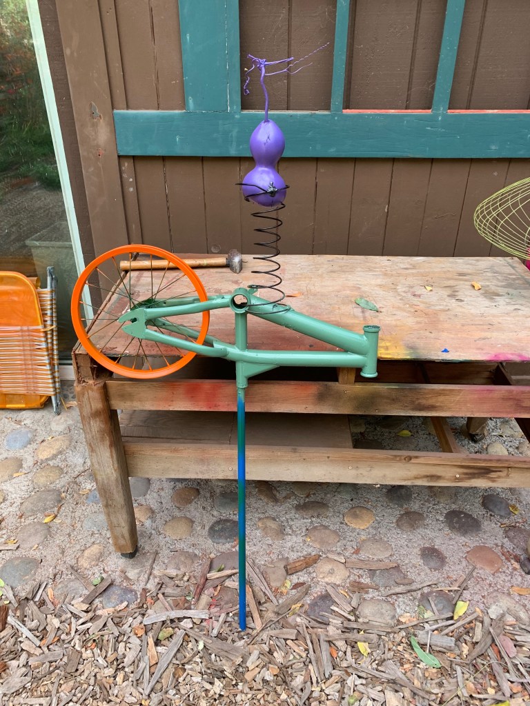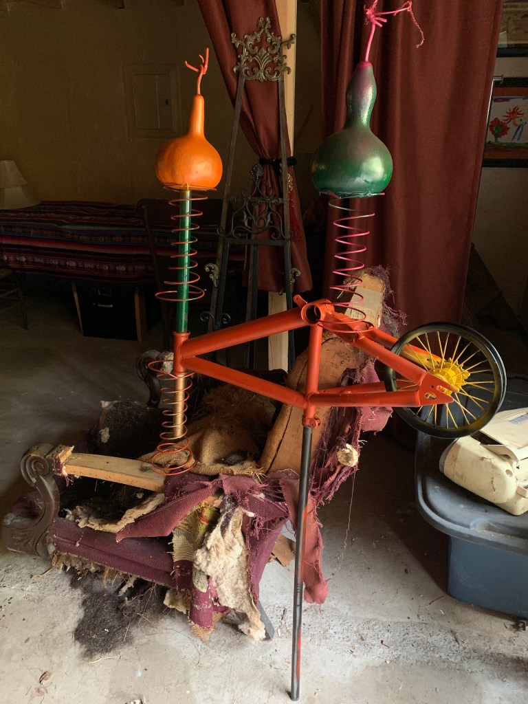Repurposed pieces included: bike frames, chains, and wheels, antique chair springs, metal rods from a bunk bed, dried gourds, PVC, cow bones, wine barrel rings, lamp shade metal frame, smoothed black locust wood, and blown glass pieces.