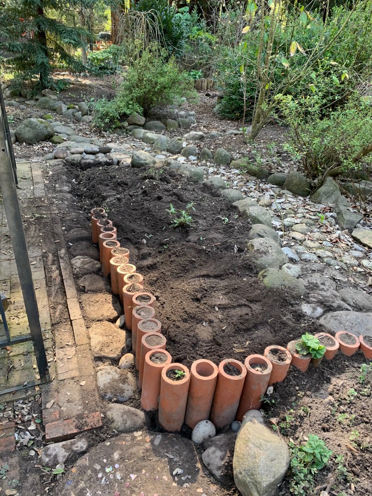 Makeover for a planter bed near the Brick Patio. Removing a small border of river rocks to add clay tubes from the garden. I got half way done today.