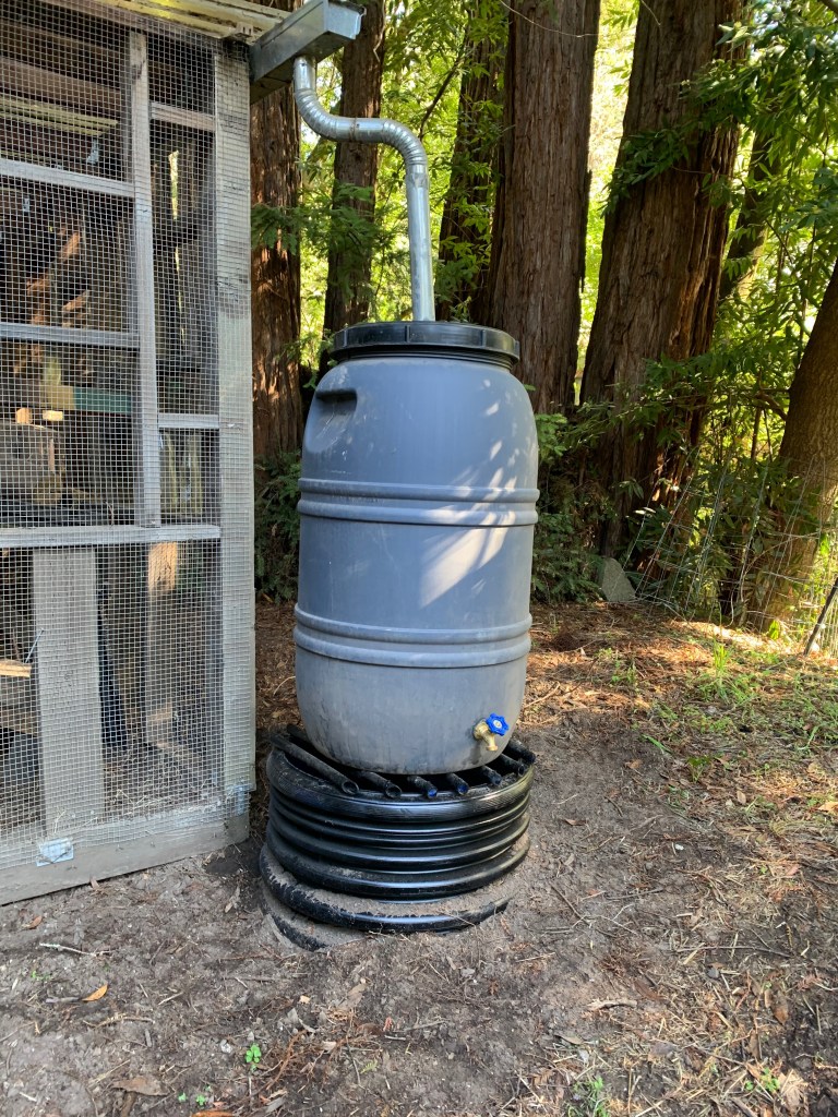 After the first rain last week, 1/3 of the barrel was full of water off the huge chicken coop roof. I’m going to add the second barrel here for the overflow. The intention is to use a hose and water the green waste compost bins.