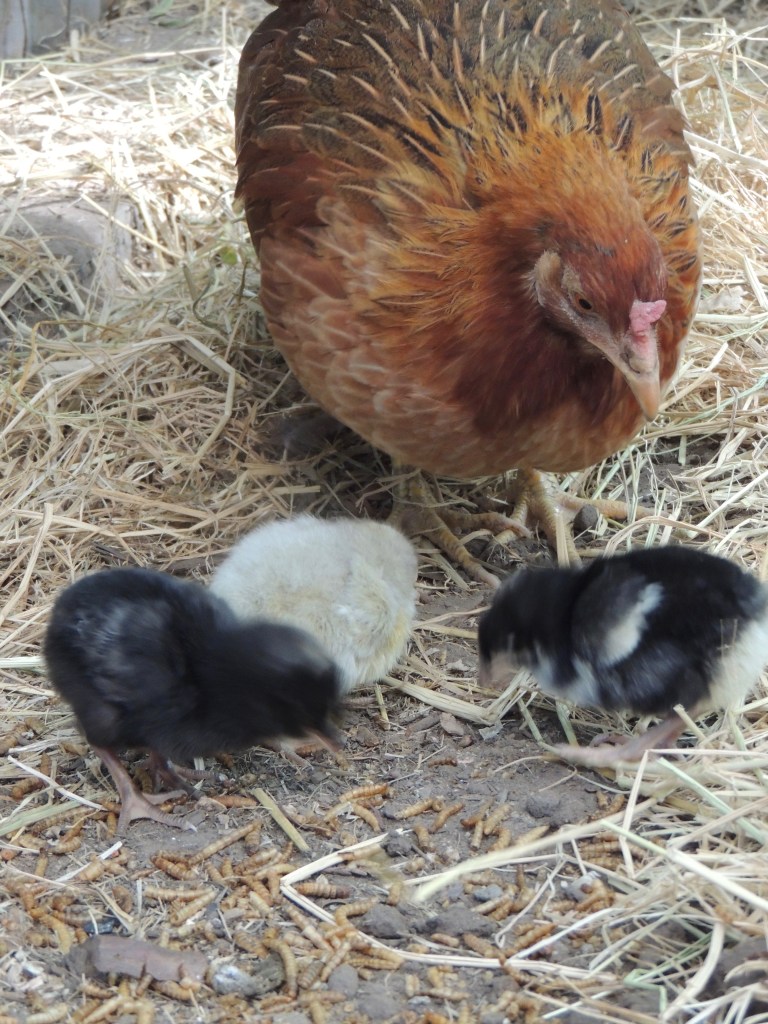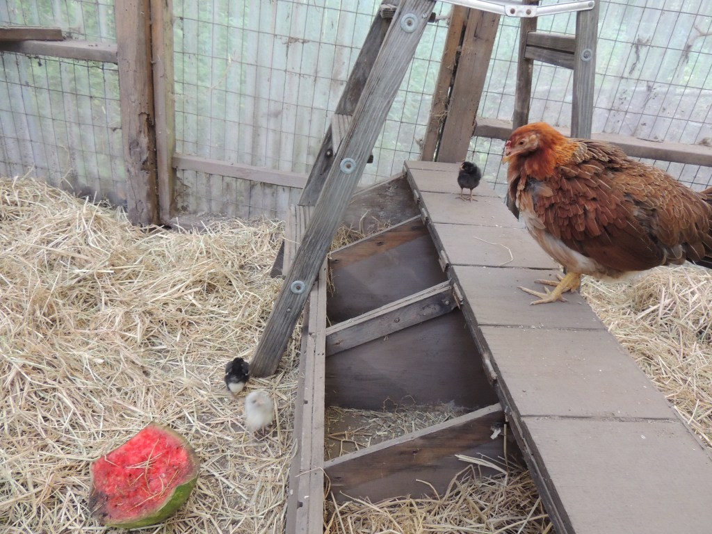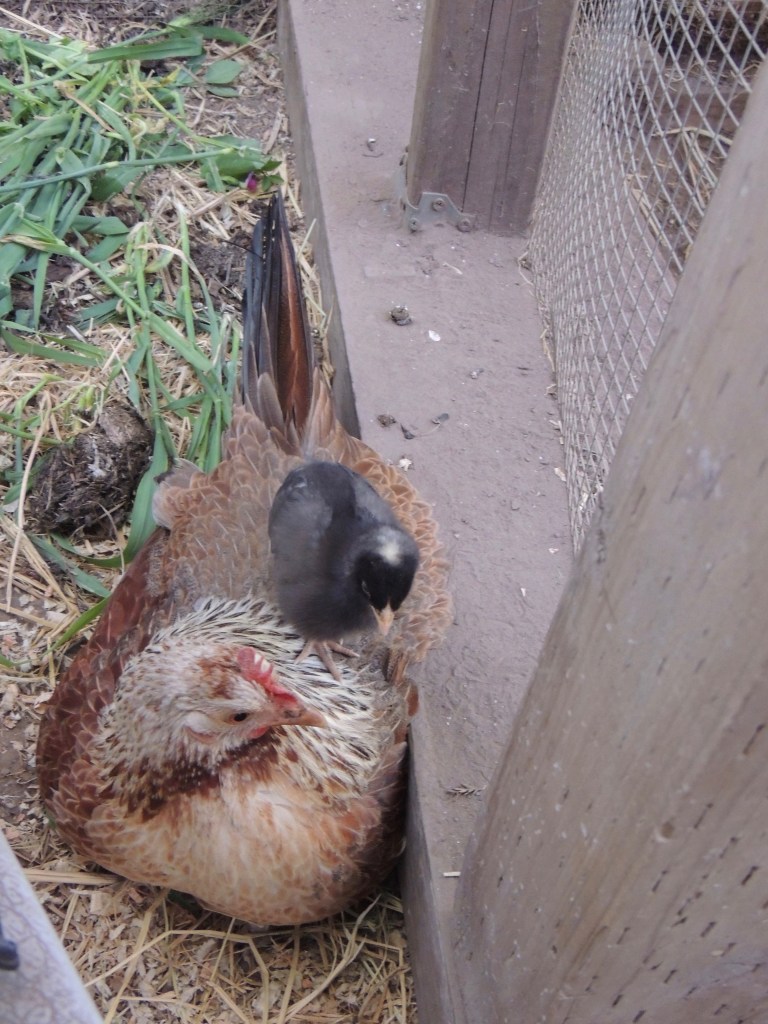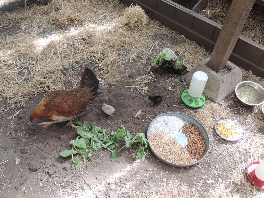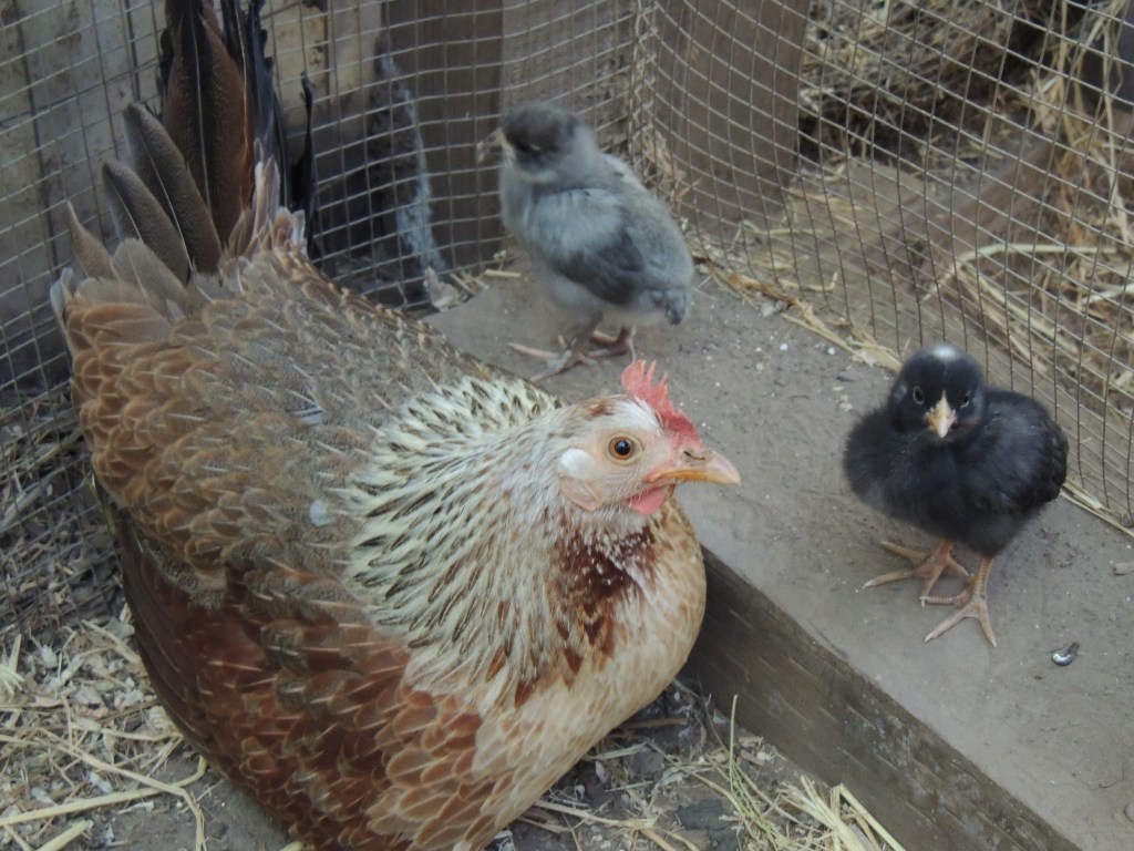 Goldie is the kind of mama hen that promotes independence. She is very “stir crazy” in her space, so she jumps over to the other side. When she does this, she starts to attack Georgie who does not fight back, rather Georgie is scared of her and jumps up onto the cat crate leaving her chicks. Fortunately, Goldie does not attack the chicks. In my stress, I wanted to put her out with the other hens, and I opened the door. One of the Bantams came in and a huge fight ensued, with Goldie really not winning, so that did not work either. Now, my solution is to keep Goldie occupied with rice straw, wheat grass, and dirt to scratch. She still crosses the “line” but is a bit more relaxed and less aggressive. It seemed to happen when I locked the cat crate door over night which I do not do anymore now that the chicks are larger.