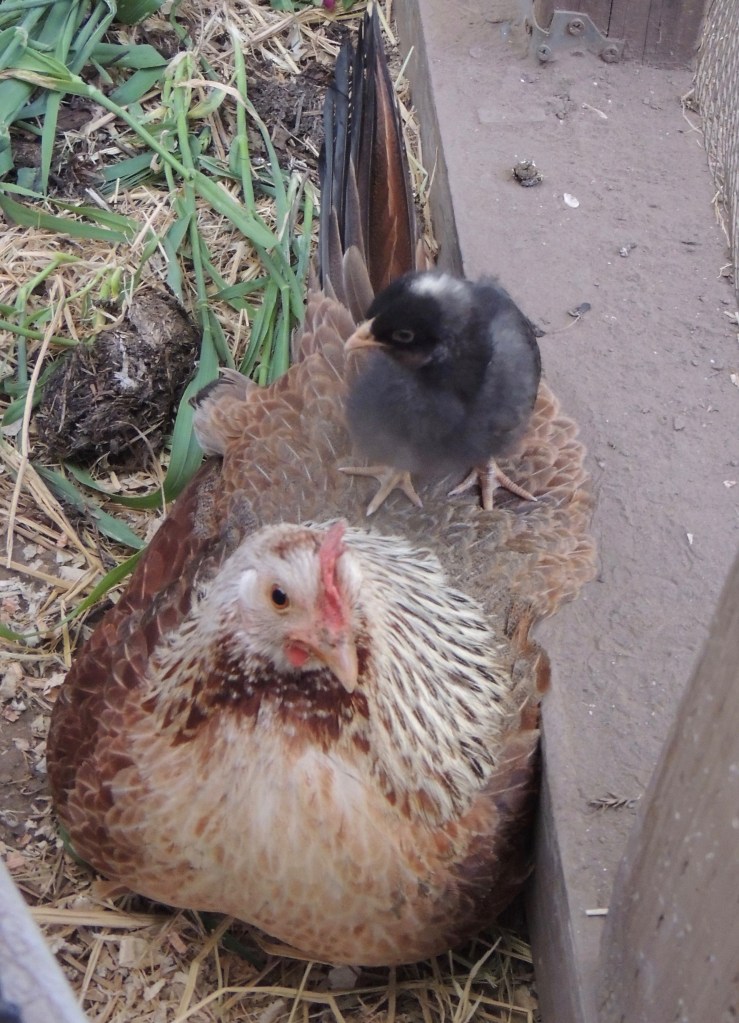 In comparison, Georgie is a dedicated mama hen. Her babies won’t go off and investigate without her, and she does not leave them, like Goldie. She sits in her dirt space to be the mama keeping them warm. When I bring them treats, like grass and rice straw, she teaches them what to eat with chirps. One chick loves to ride on her back.