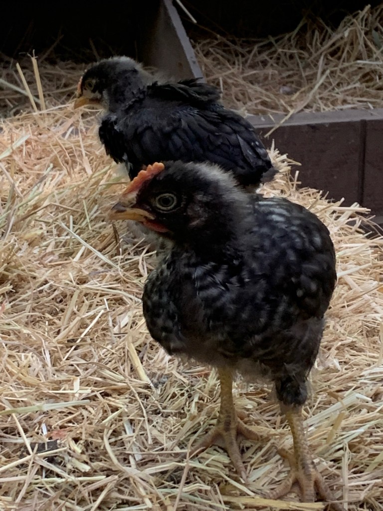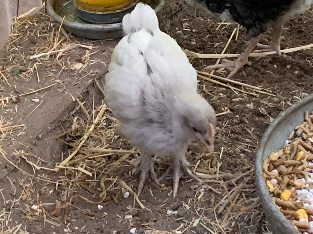 The chicks are now four weeks old. It’s very obvious due to the larger comb on two chicks that they are roosters, and they “play” fight at each other.