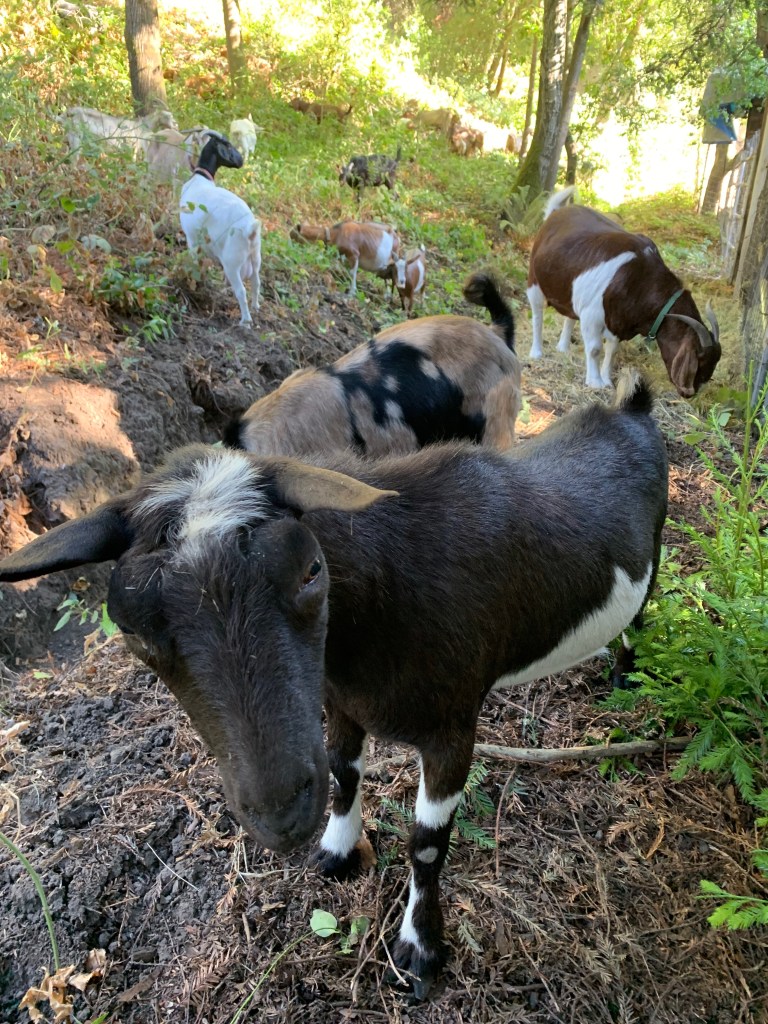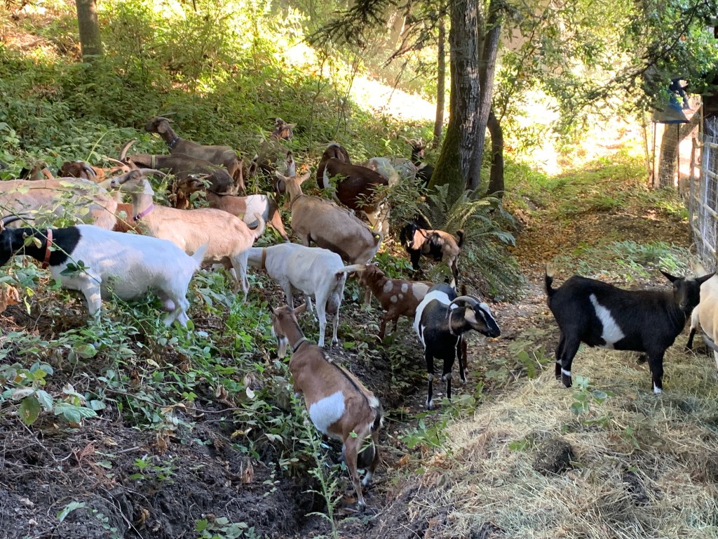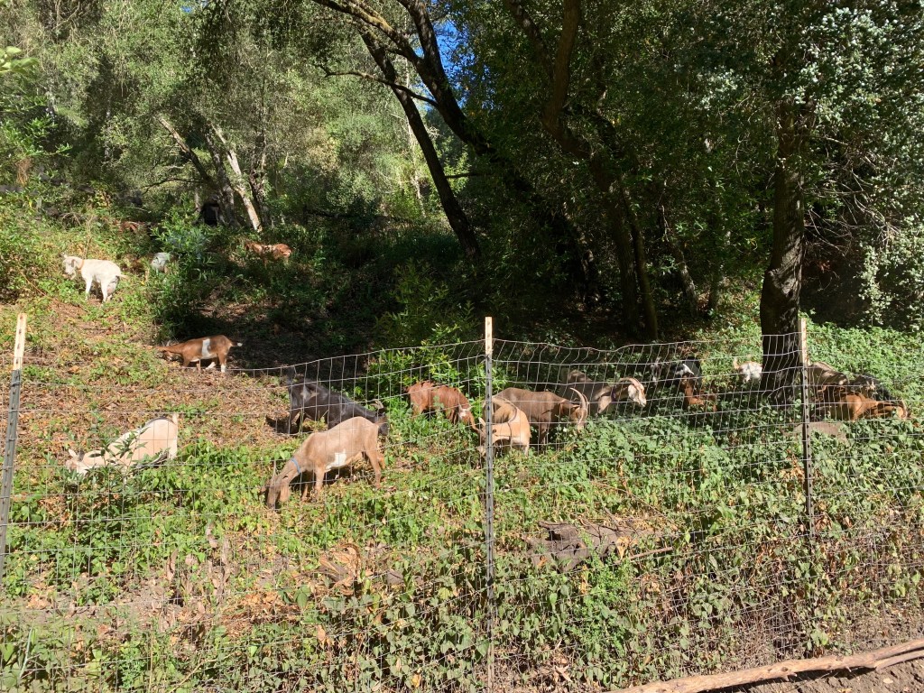 44 goats and a 6 month old long horn calf are here to eat up the hillside which has never been managed. We are finally at that point to clear the hillside for fire management. Two shepherds and Wes Sparling, the owner, cut and weed whack while the goats eat it up.