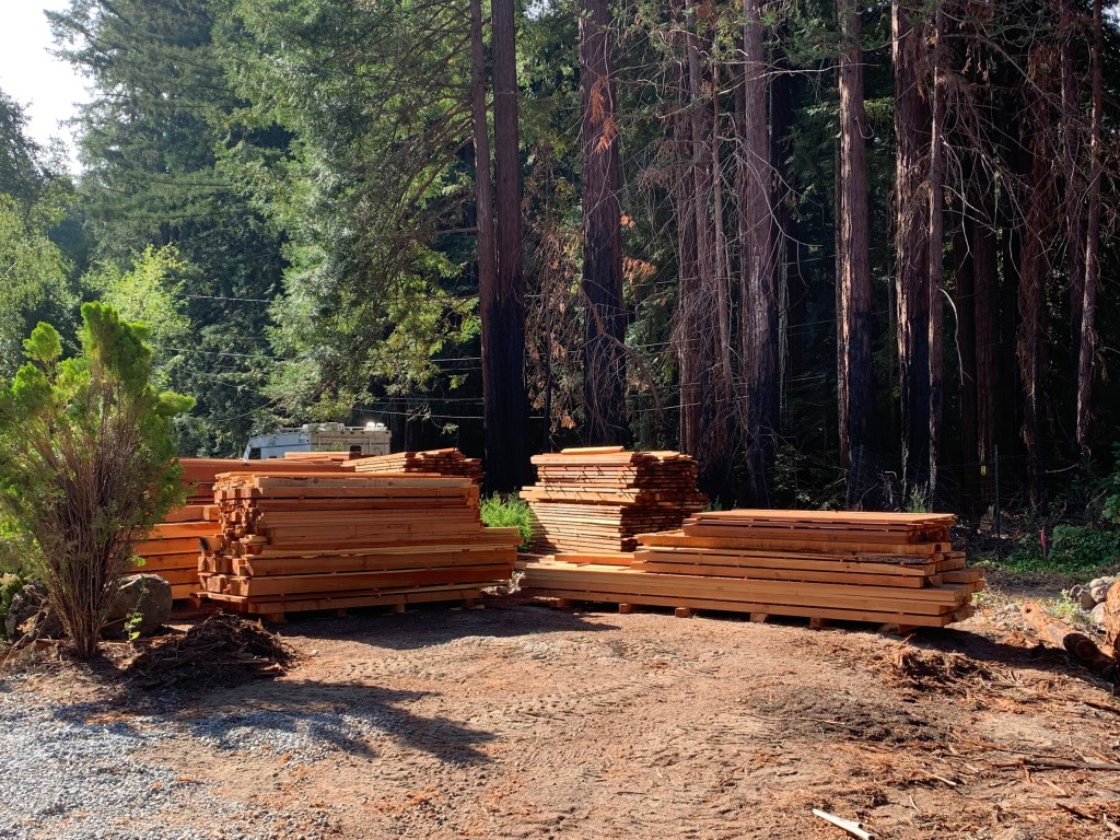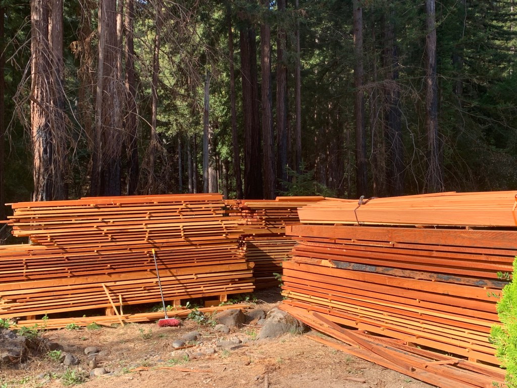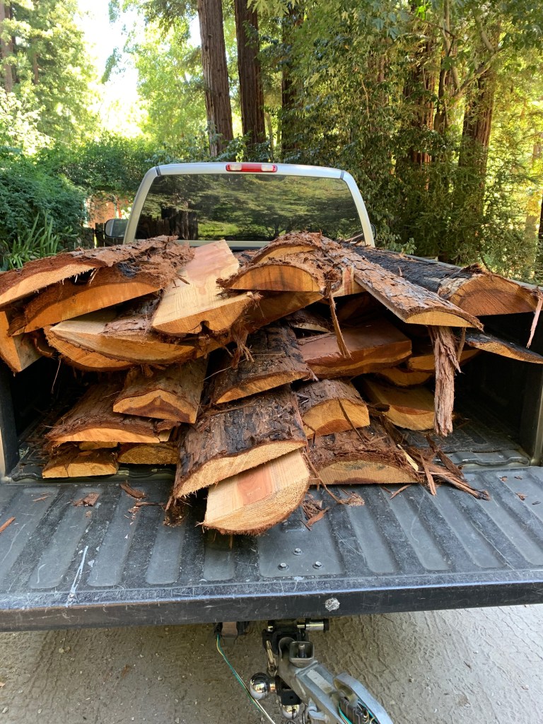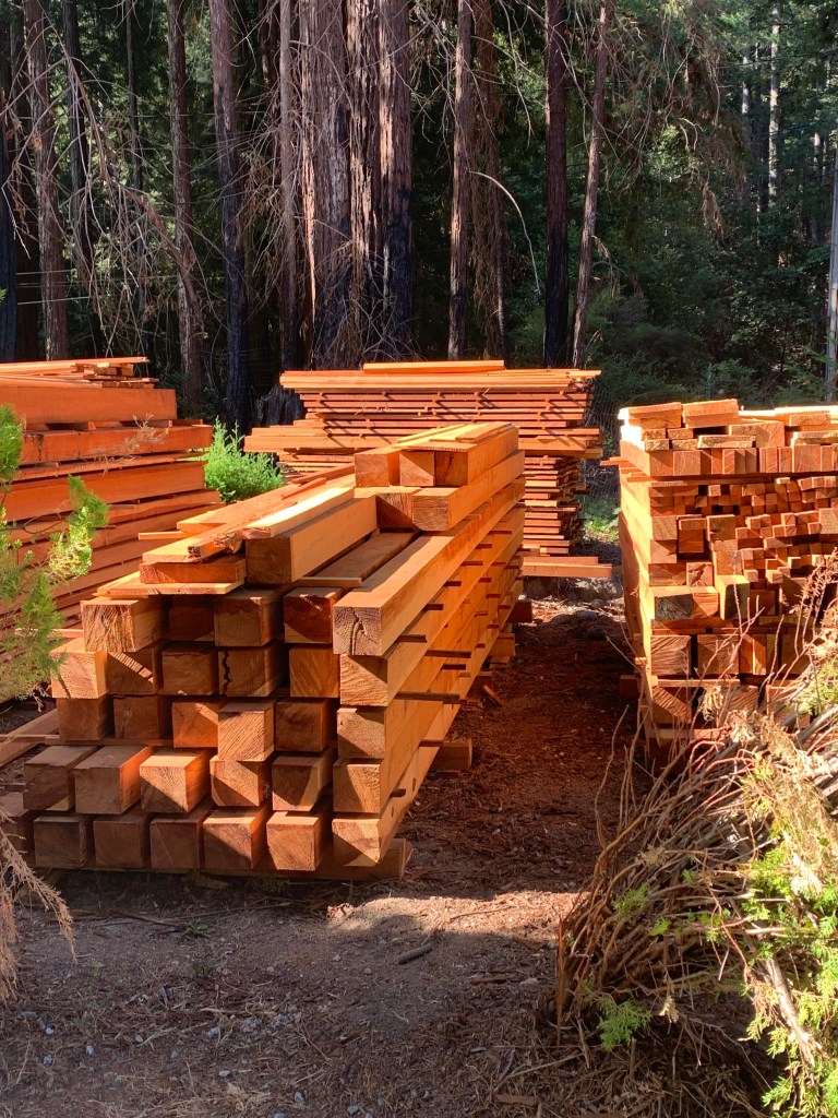 Linda and Tom kindly let us salvage redwood bark mill scraps from 31 burnt redwood trees. They are rebuilding their house which was destroyed by the CZU fire in August 2020 so the trees had to come down, and they had all the trees milled.
