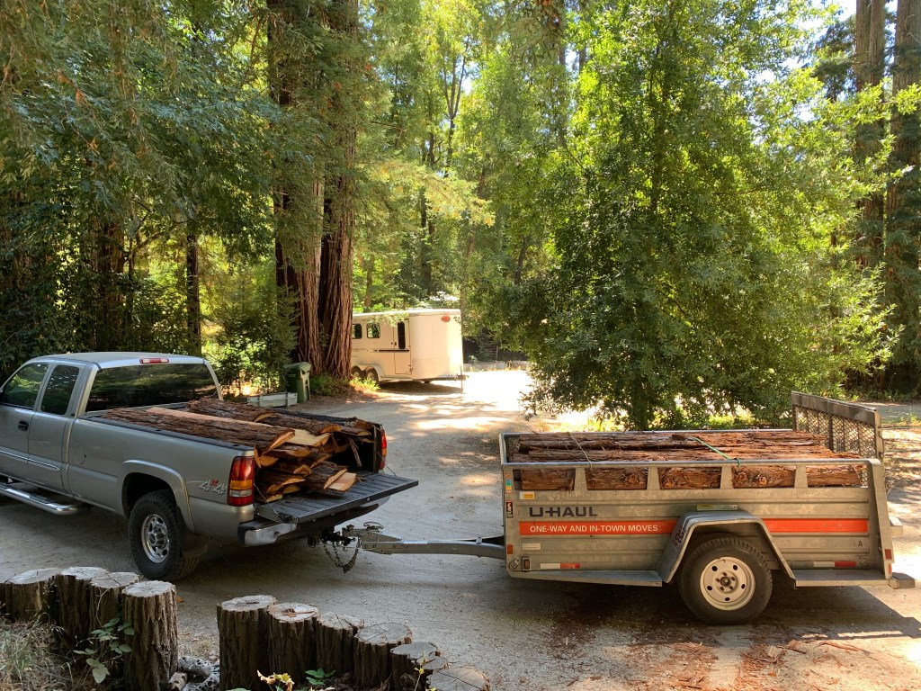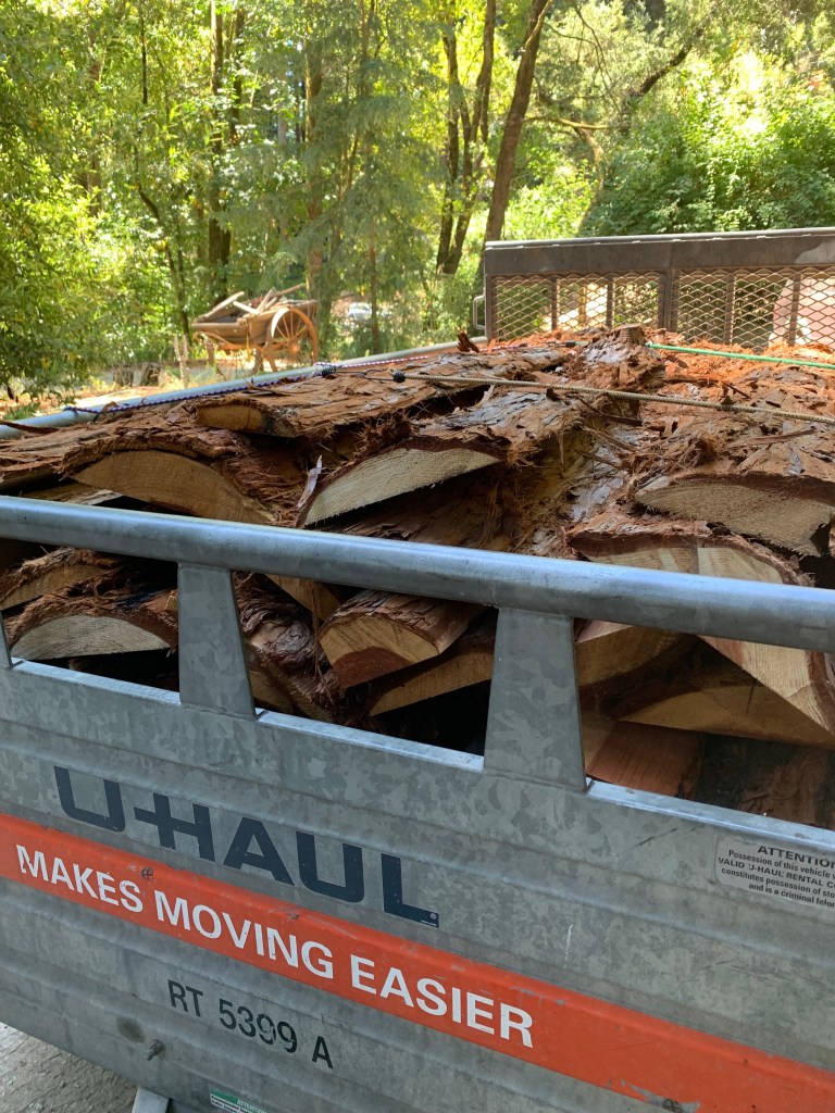 We met them on two days at the property in Boulder Creek to pick through the piles and chainsaw the 16′ long pieces to fit in the rented Uhaul trailer and truck bed. This bark will be the siding on the “goat” barn that we bought this summer from Jan and Dave. Once it is rebuilt on the farm, I want to introduce the four of them and show them the barn.