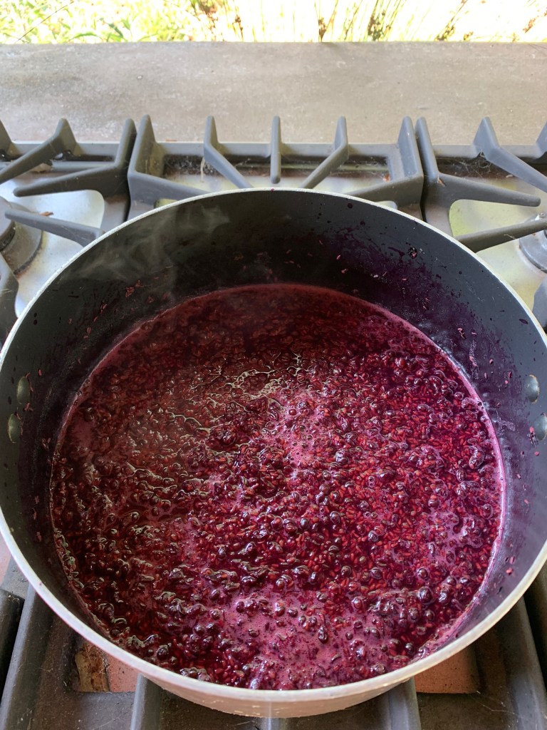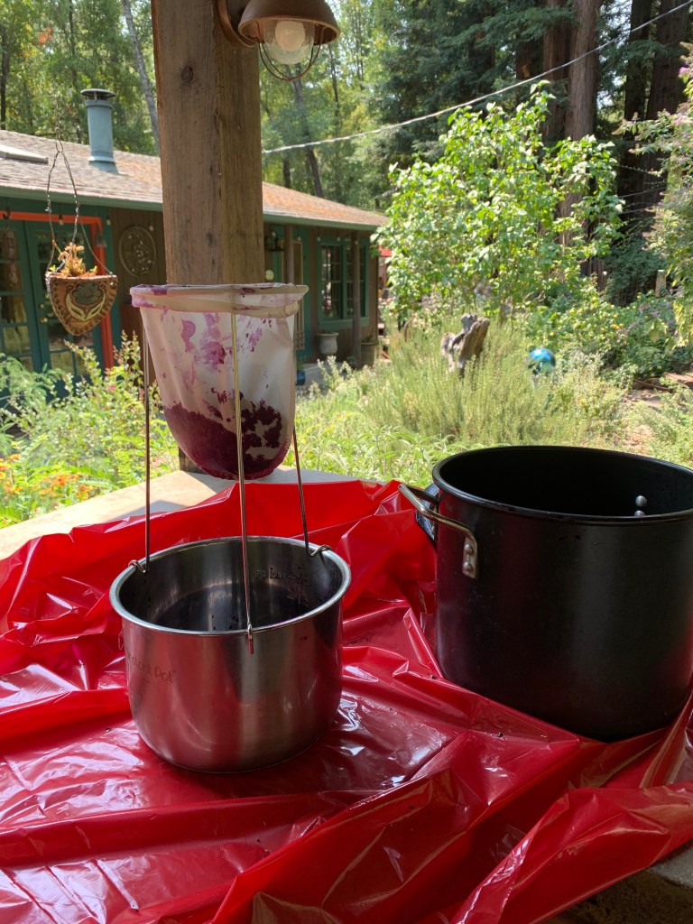 After washing, boiling, and mushing the berries, the juice strains out very slowly.