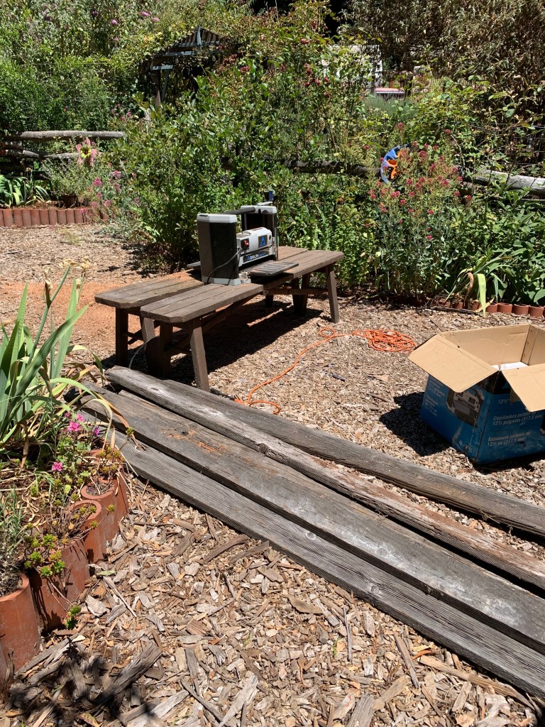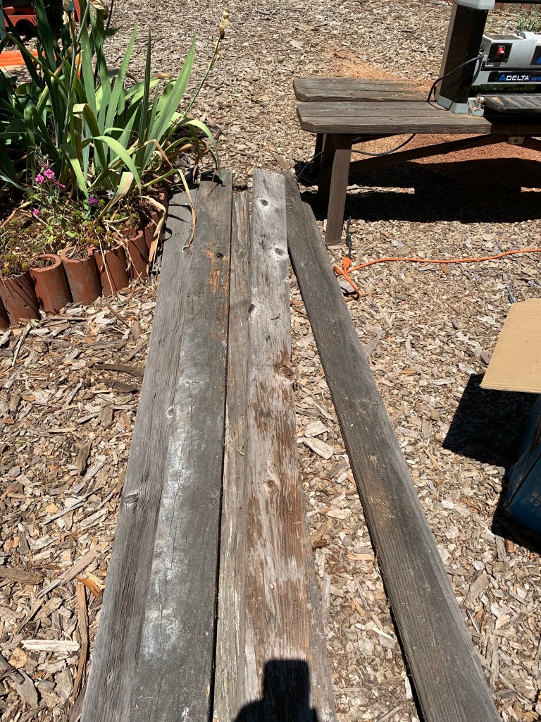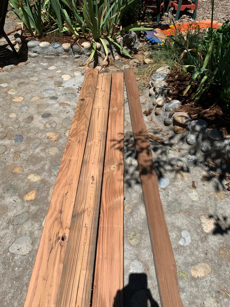 The wood for this door was free from a woman who was going to take it to the dump. The redwood was pickled with termite tracks, covered in moss, and looked used and weathered. I wanted to give it new life so I planed down the boards and build a heavy door. It’s blond now but will fade to brown. Or, I could stain it to match the darker wood.
