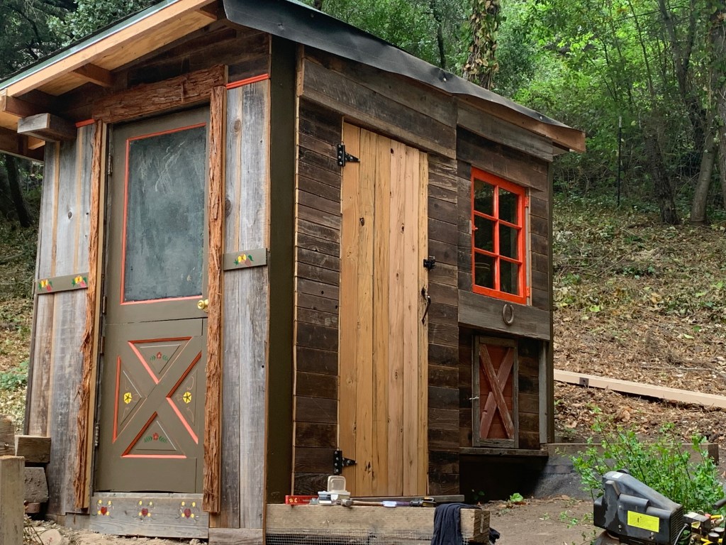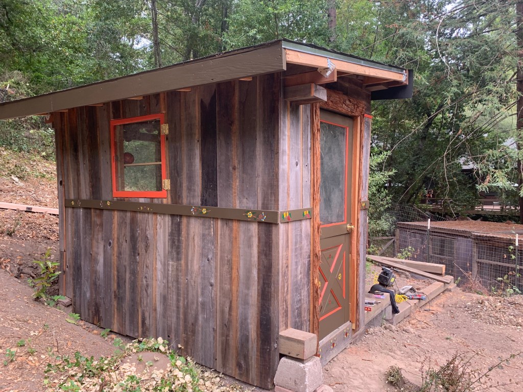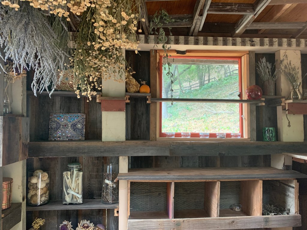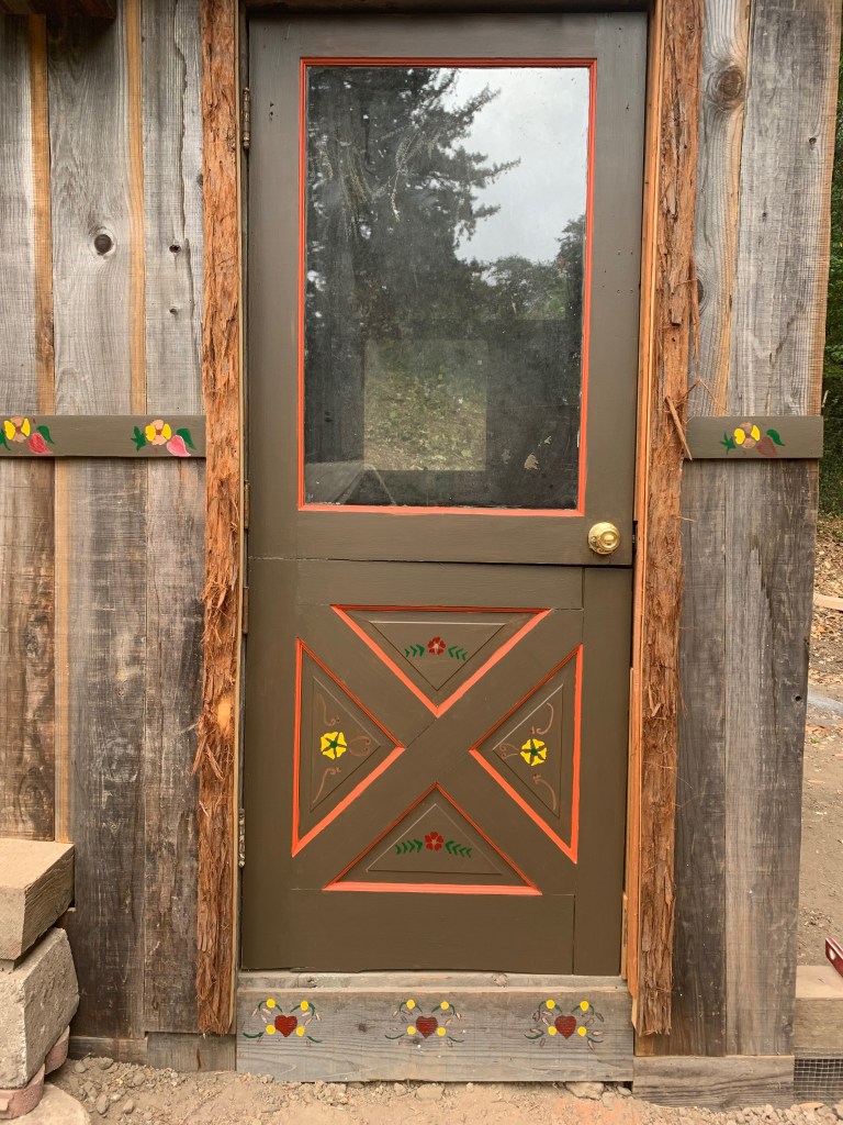 Latest update on the Herb and Flower drying shed. We’ve put in a window, painted the front door, added a floor, installed a side door, and there’s still more to do. The little touches, like painting with stencils, give it a special touch and added character. Also, our brown and orange colors are consistent with our house colors. We never deviate from our three-color scheme for unification (brown, orange, and green).