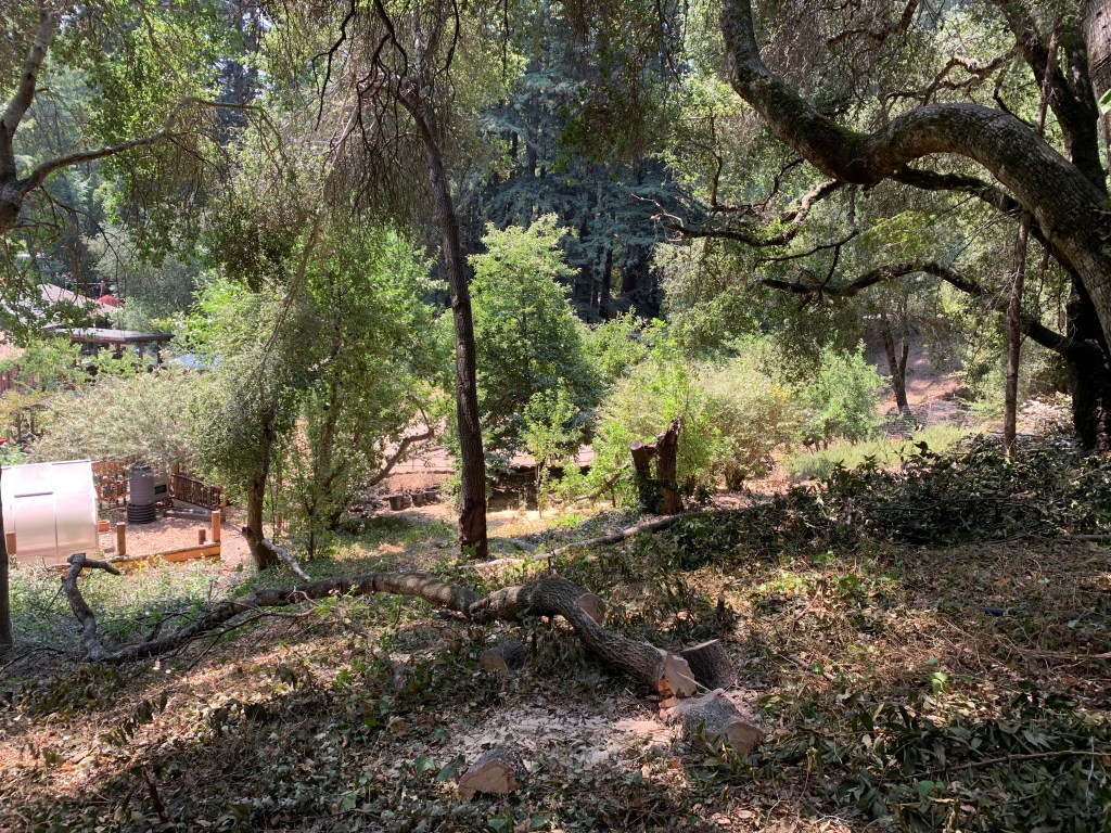 We have almost all the trees cut down on the hillside. Just three more to go. We have too much brush to handle ourselves, so time to get some help. We are also raking all the leaf duff to get to dirt.