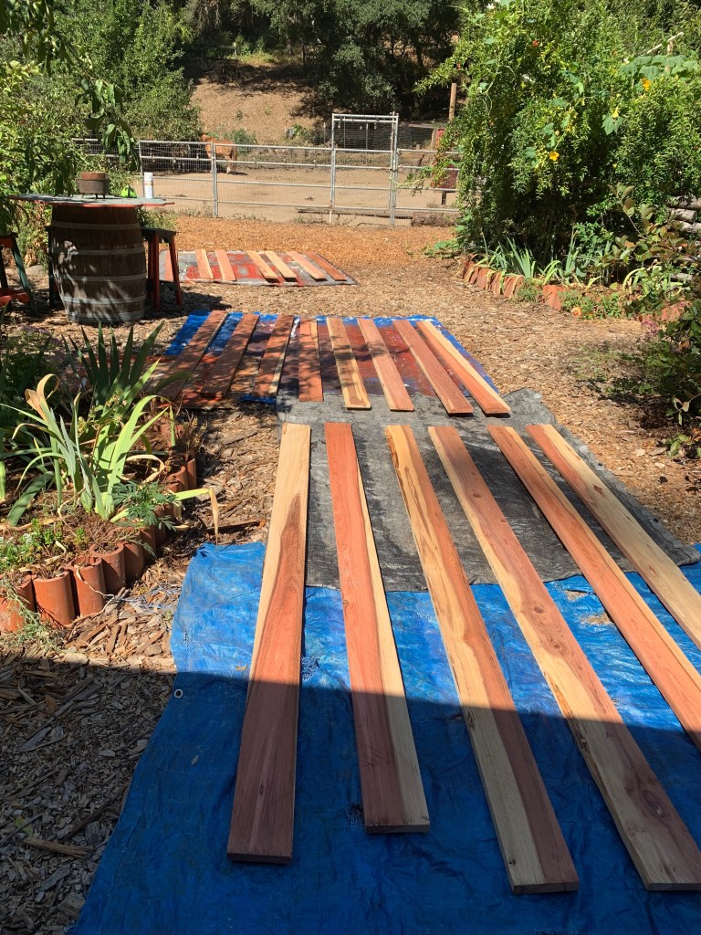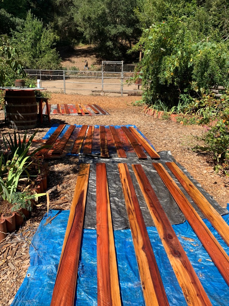 I bought common/red redwood fence boards from my miller friend, 1x6x9 for $7 each. I coated each board with linseed oil to help them last. I’m excited for a new, improved look to the farm.