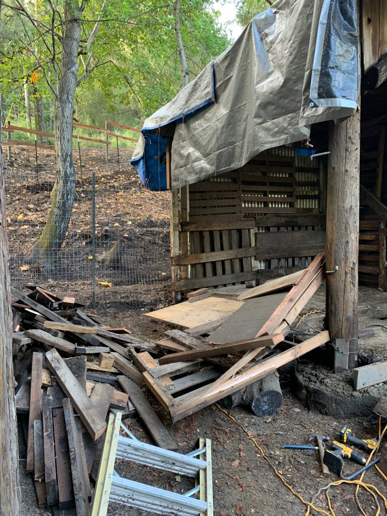 We’ll keep plugging away on ripping this apart. Once things are cleaned up, I am measuring the space with the option of building our barn here, rather than up on the second level. It seems practical to use the barn pieces here, and mix and match pieces of it. I would not use the roof trusses here because I want the roof sloped with all drainage going into the swale. We also do not have to make the barn 21 feet long. The pony needs to be locked up at night from mountain lions so this might be the best solution.