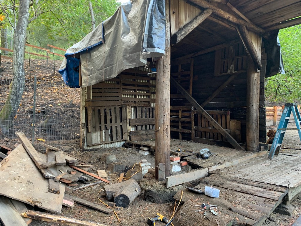 In the meantime, I am tearing apart the Goat Barn which has only be used in the past few years to store random things, like doors and windows (for the Art Studio) and wood. Upon tearing apart the old wood and pallets, it’s definitely visible that moisture has rotted so much with termites and lots of old goat and rat poop. A couple of rat nests with a rat scurrying out and a mummified rat. Glad we are tearing this down to build over again with a nice corrugated metal roof instead of leaking tarps. I’m even thinking about using the recycled redwood 2×6 for a floor for the art studio. It is so rewarding to repurpose things.