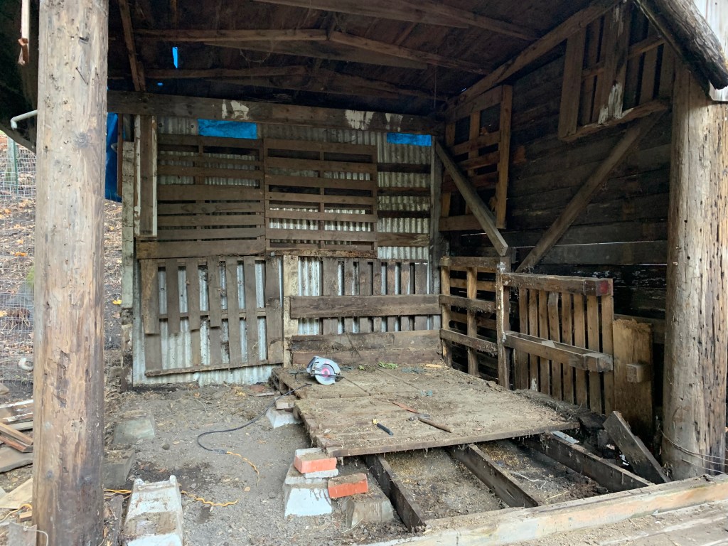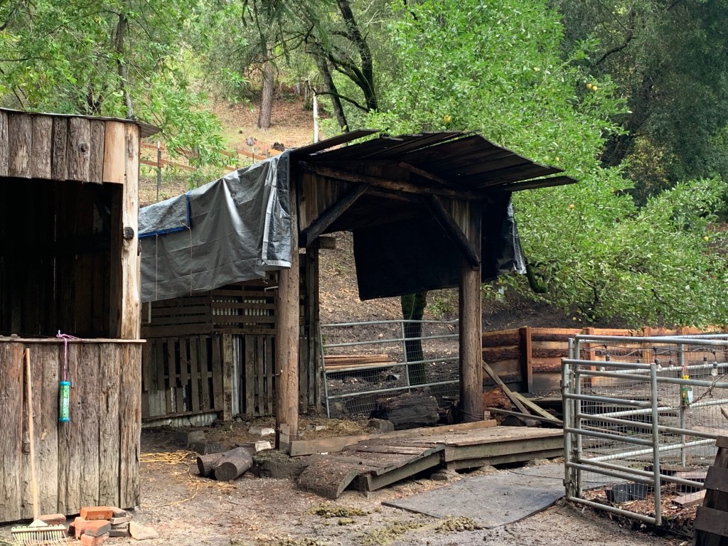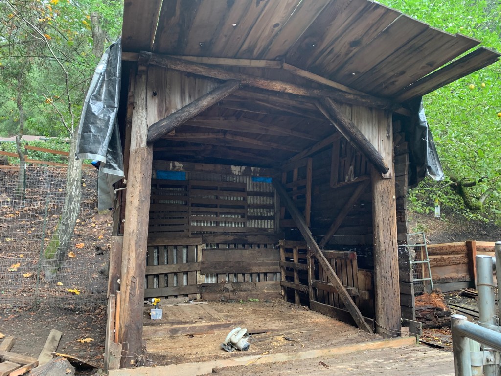 The Pallet Goat Barn is coming down. It was a fun building when we had our goats, and over the years, it became storage. When the floor started to sag, it was obvious that it needed to come down. We have our craigslist find/barn sitting in the redwood grove, so after much consideration, we can put it in this space.