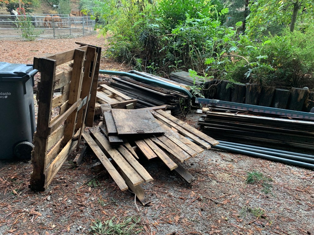 The front of the corral is a mess with wood to recycle, painted wood to dump, and pressure treated wood. I want to wait until the roof comes down before doing dump runs. I’ve already done one dump run for the sides, a lot of pallets and rotten wood. I can’t wait for a clean and clear space.