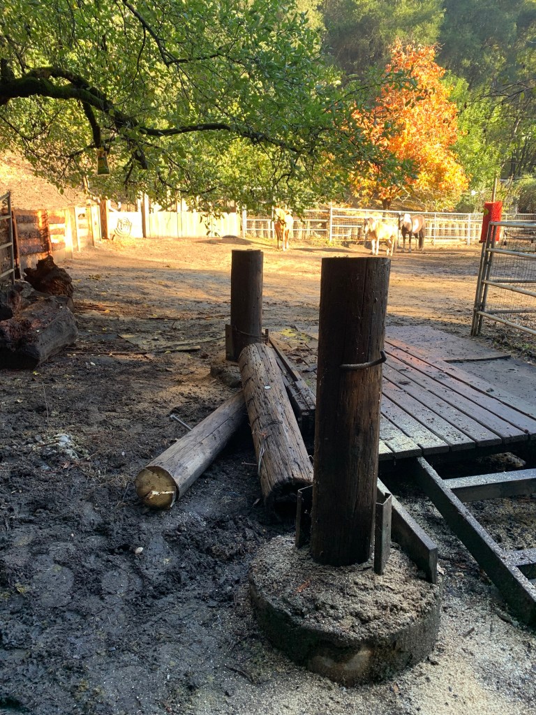 When I shook the telephone poll, the cement blog rocked. I decided to cut them down and good thing, one was rotted in the middle. Now, we’ll see if we completely remove them with a jackhammer.