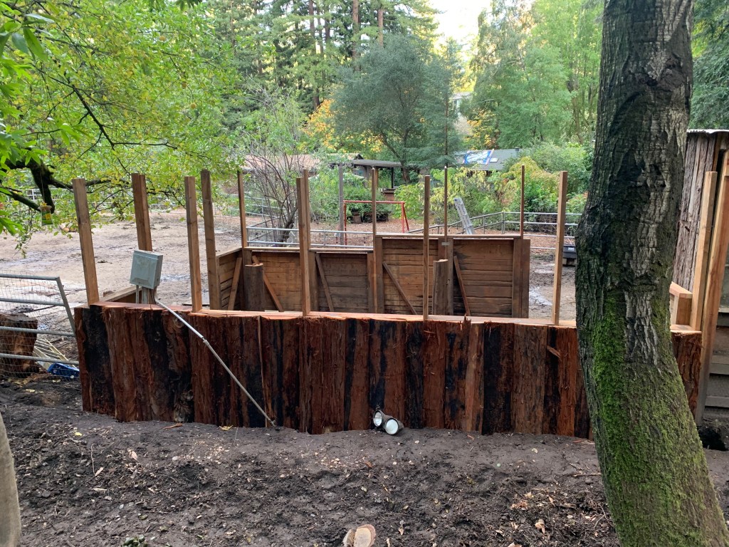 For the back well, I had to enclose the original door opening, I put one panel in the center. This left a gap of space about 15.75 inches on either side. I cut the other panel up and used all the wood to stitch the back together. I also used the wood I removed for the side door. Nothing was wasted, and it works! I like seeing the fir wood on the inside since it is rough cut. The whole outside will be covered with redwood bark so we won’t see the frame again. This is just one spot where the outside style is visible.