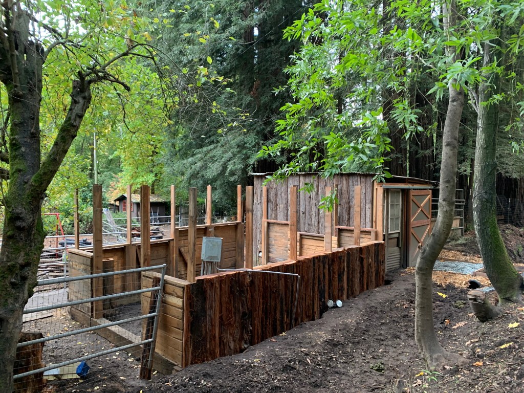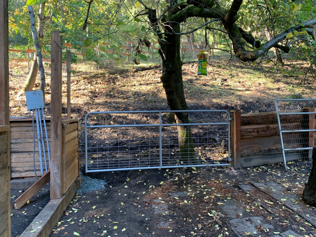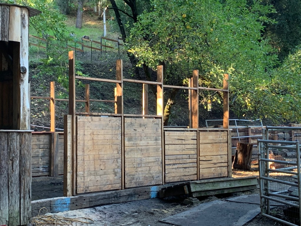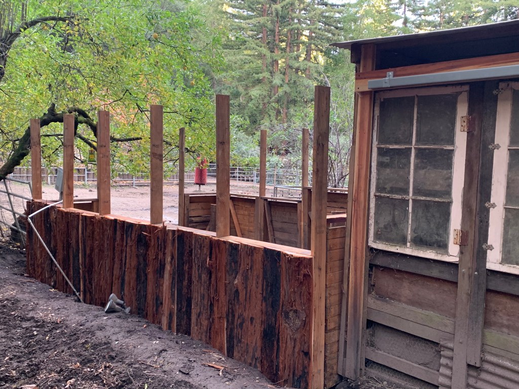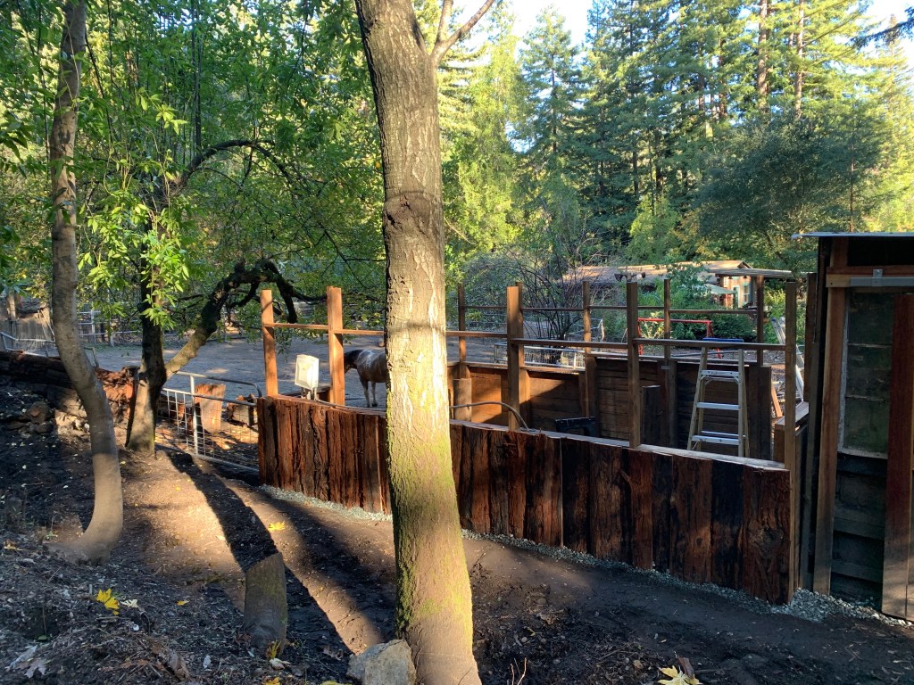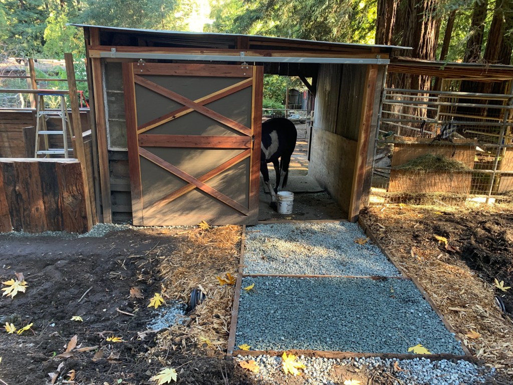 Next, Will and I installed a farm gate bought off craigslist over a year ago. There was never the “right” place for it until now. I had opened the doors up to the hillside, and Shasta decided to go up, but he jumped both steps, very leery of the steps as well as going through the horse stall. He would not come back inside the corral to eat. We had to move a horse pipe corral panel we had leaning up to block the space so he could walk back in. If we installed the farm gate, then there would be a third in/out door for us and the horses. Plus, it saved me from having to build more of the redwood bark wall.