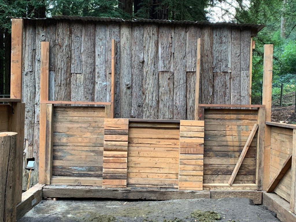 Lots of progress as we are plugging away on the recycled barn. On the back side, milled scrap, redwood bark slabs were cut 4 ft. as siding. The redwood bark was salvaged from burnt redwood trees from the CZU Lightening Complex Fire in Boulder Creek. Some slabs are charred black. Once the roof is added, we’ll decide where to add more up to the roof line and possibly enclose some of the window openings.