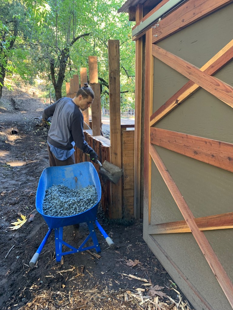 Farmhand Will Burke filled in the trench with drain rock. He also filled in the step up outside the barn door. It took a yard of drain rock.
