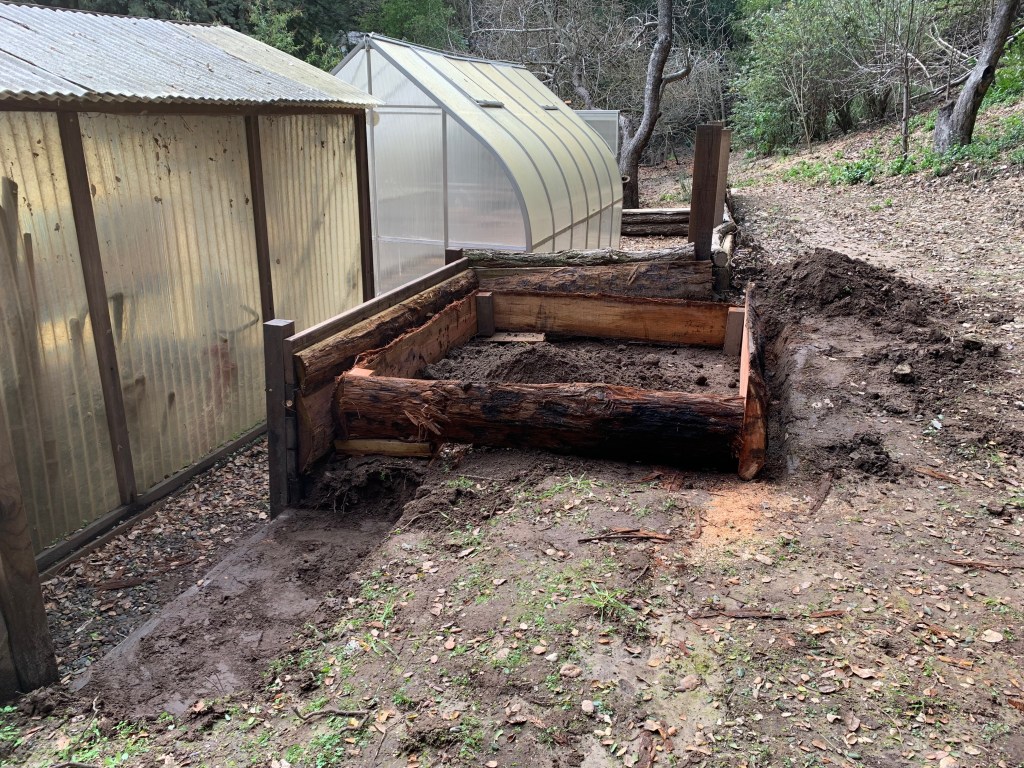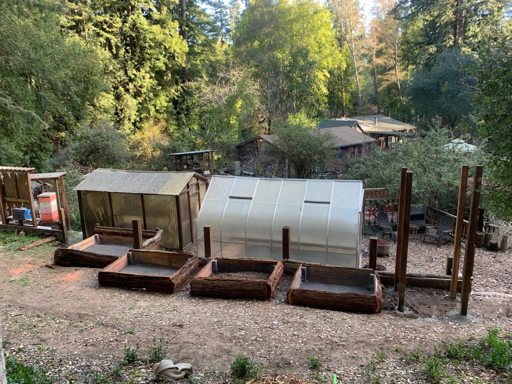 Yesterday, we finished the four planter beds made from redwood bark slabs. Today we added the cement wire to keep out gophers. We also cemented in 4 10′ redwood 4x4s to make a stand for a new bee hive. Next weekend we’ll fill the planter beds following a permaculture system of laying plant debris and branches on the bottom and layering manure and compost.