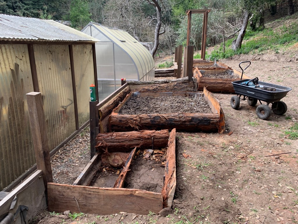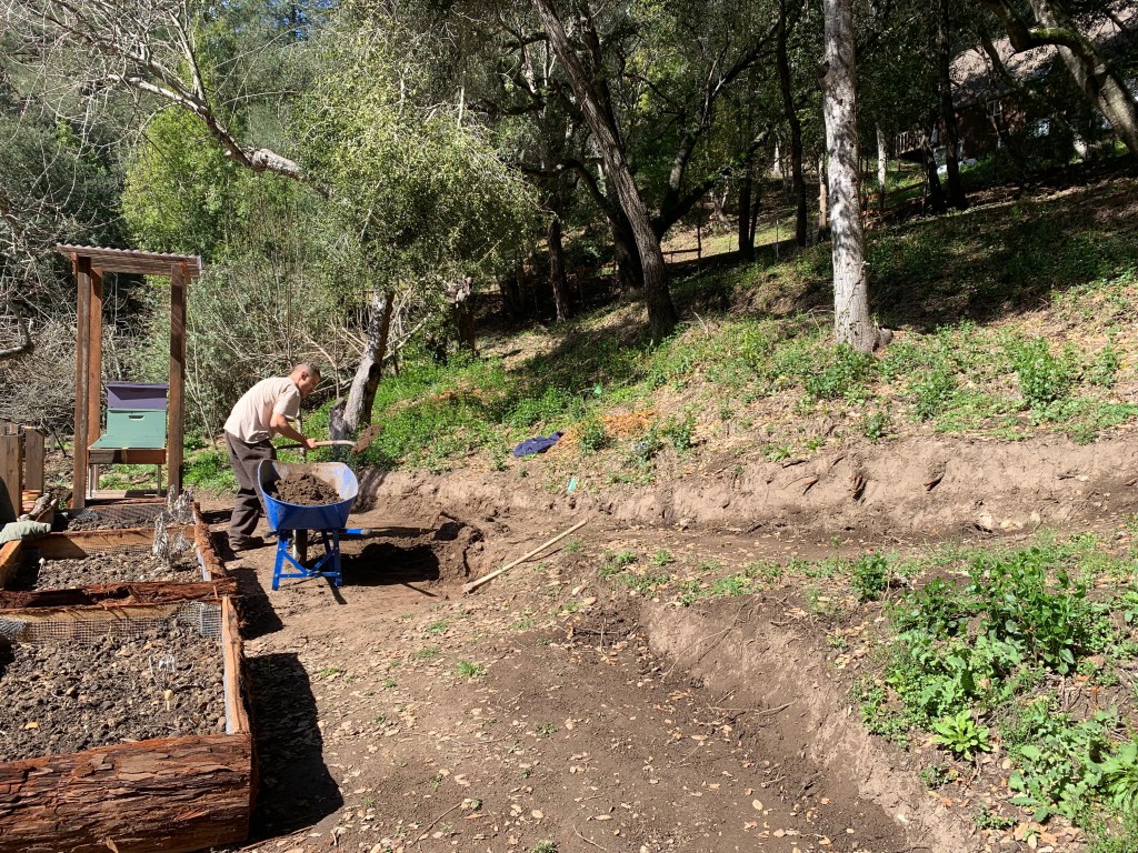 Yesterday, Will and I teamed up to level the walkway by the new redwood bark planter beds. The hillside was sloping up and it needed to be flat.