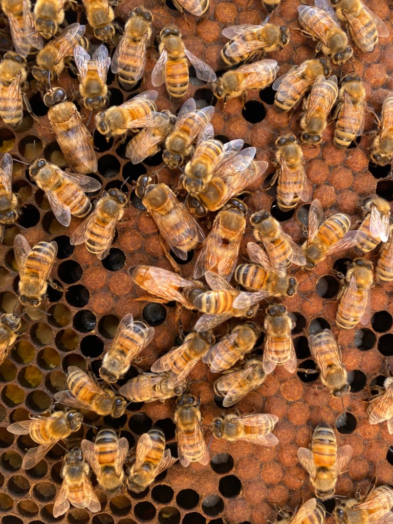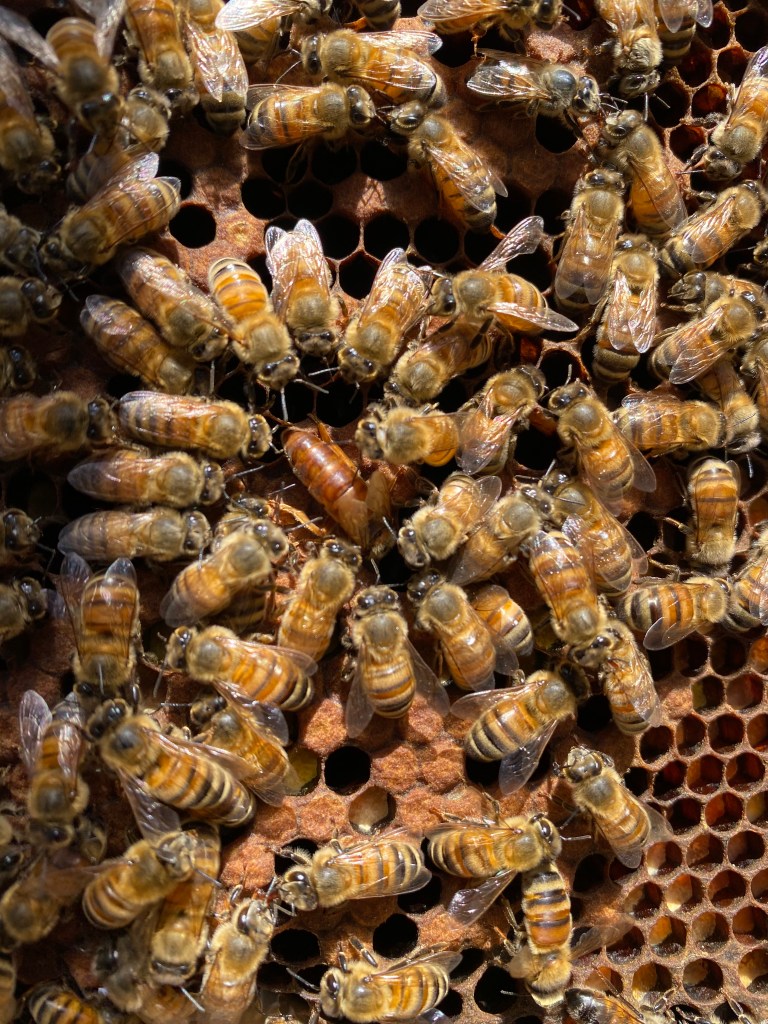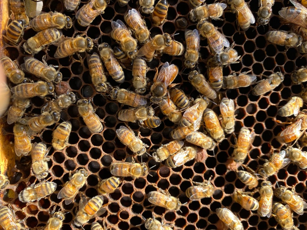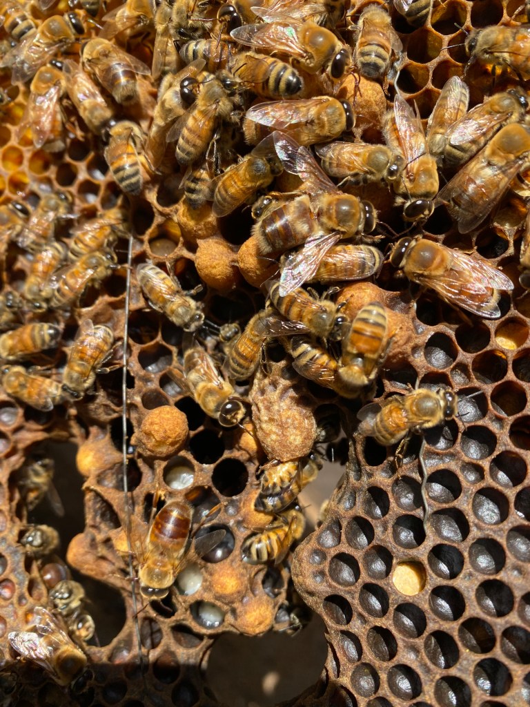 First was a mite check, and all looked good with a low mite count and some wax moth poop. We did notice about 3 worker bees with wing deformity. There was a good combination of frames full of honey, pollen, and brood at different stages. The original mother queen was laying, which we caught on video.
