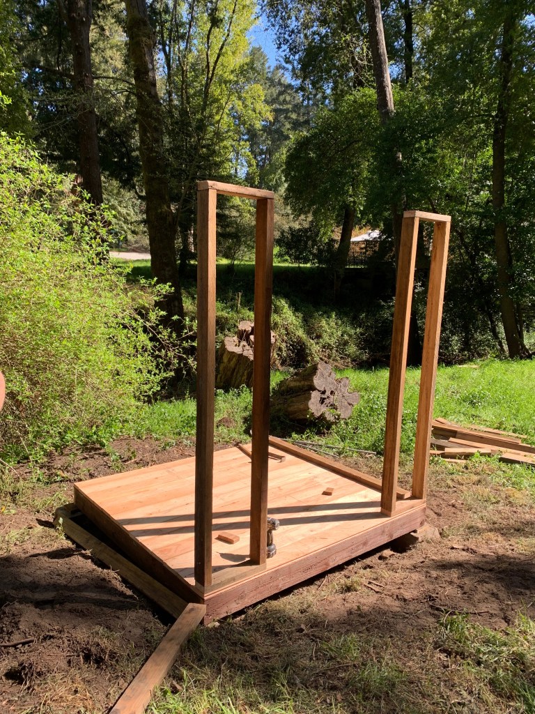 The generator shed is moving quickly. We were able to use materials laying around, such as 2×4 redwood and tongue and groove fir for the floor. Handyman Tyler plans to start on the siding tomorrow to use up the rest of the fir stored in the garage. I only took the fir as a favor to friends who wanted it gone, so to find a way to use it will free up space in the garage. I’ll prime and paint it this summer.