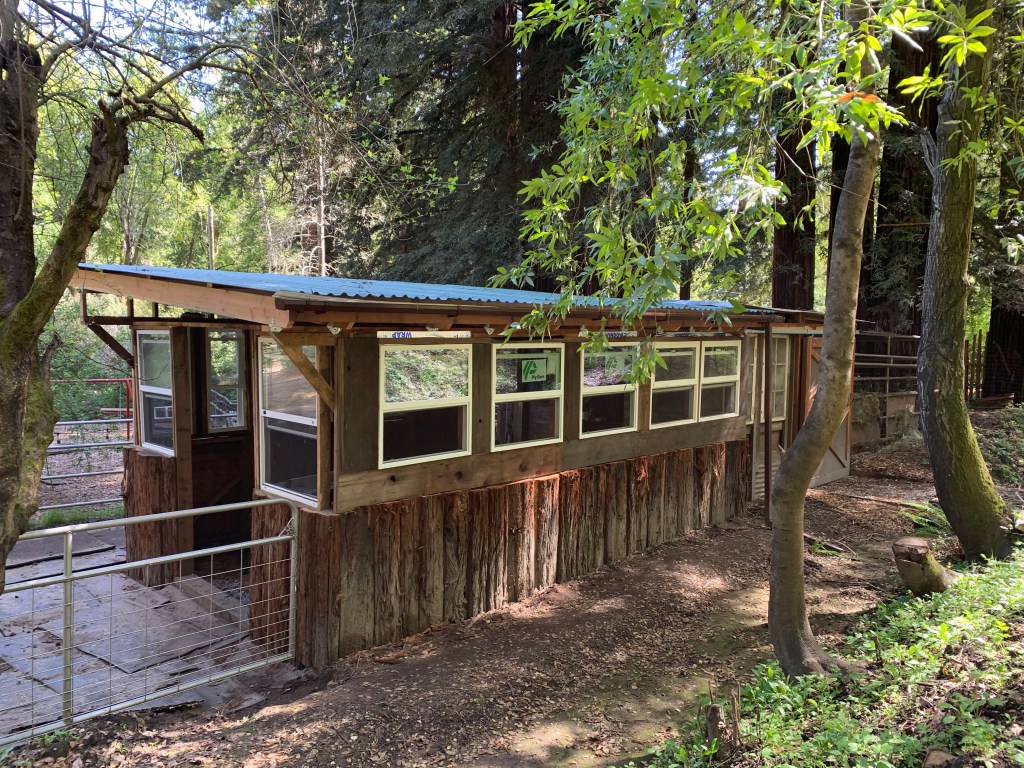 The horse barn has been a work in progress for awhile. Fred started the siding back in November, and just last week I finally broke down and bought the last 3 windows from Home Depot. All the other windows I got at ReStore (Habitat for Humanity) and craigslist.org so we could build with recycled materials. I could not find 36×36 single hung windows. Now, Fred has the back window trim on, using the recycled wood from the old goat barn roof. The last push is to cut redwood bark siding and do the tops and front entrance.