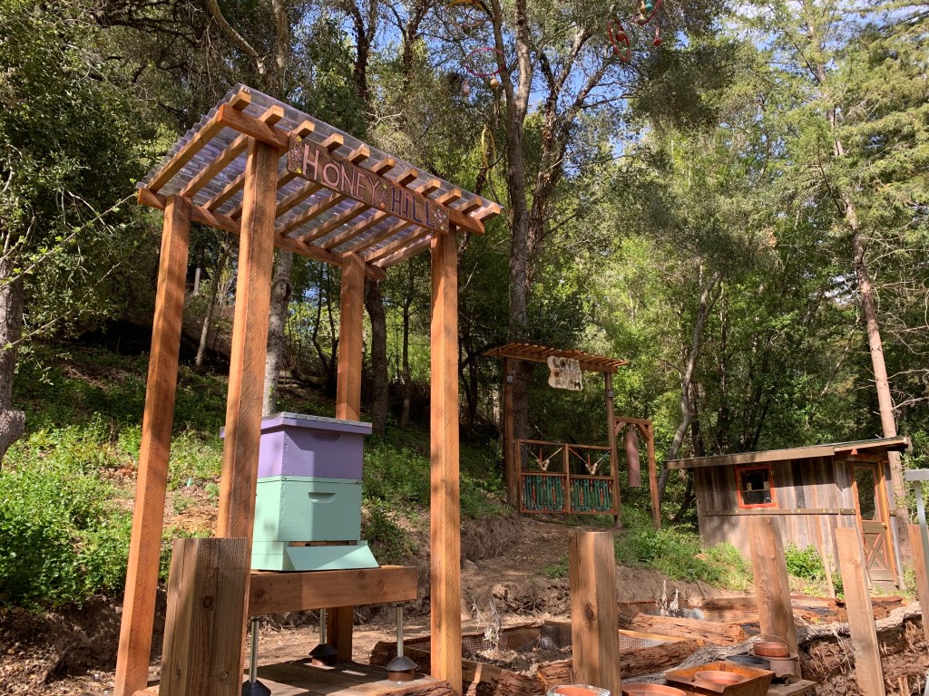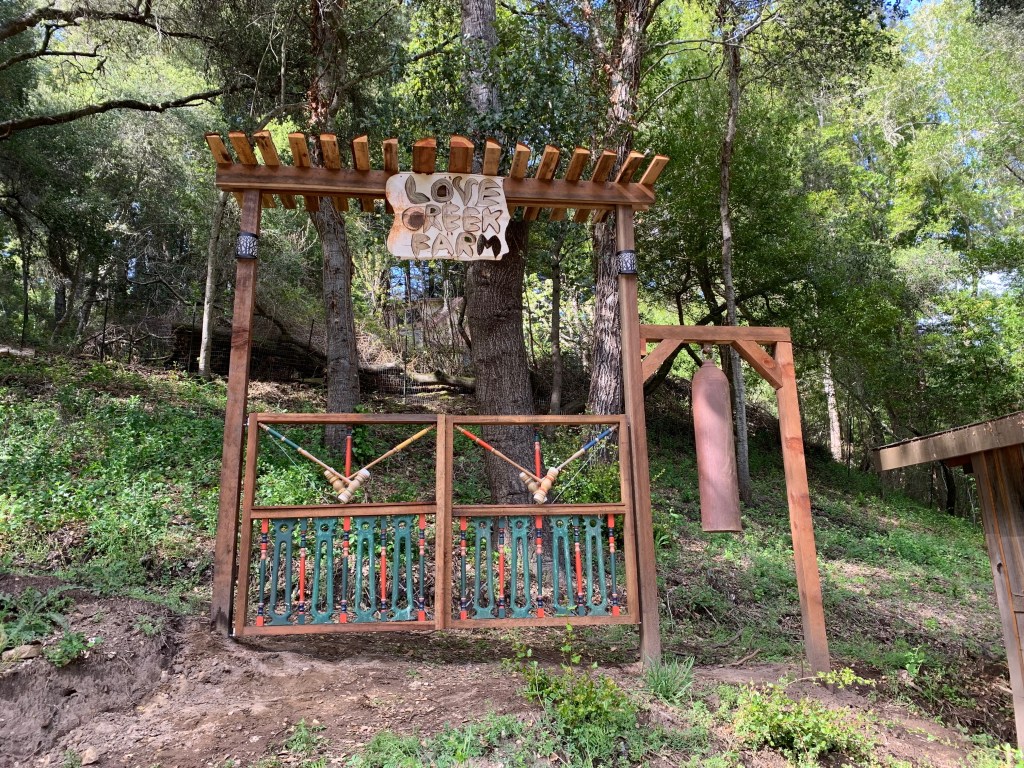 Next on the project complete check list is the gates for a new arbor we just added. At first, the arbor was super simple with just a plain 2×6 top. Fred suggested we use some redwood bark pieces I had stored, and they were the perfect choice. I bought some solar lights too, then added our metal Love Creek Farm sign. The doors were designed with leftover spindles from the farm fence plus some croquet mallets. Love it!