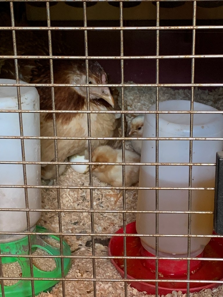 The most fun is our new mamma hen. This is her second year hatching eggs. I got 6 fertilized eggs from a neighbor, and 4 have hatched so far. The eggs are fertilized by Old English bantams: Frizzle, Silkie, and Polish Silkie. I am very excited to have new babies on the farm! Last year, six hens hatched eggs, so we’ll see what happens this year. One down!