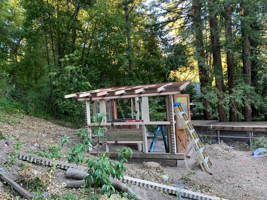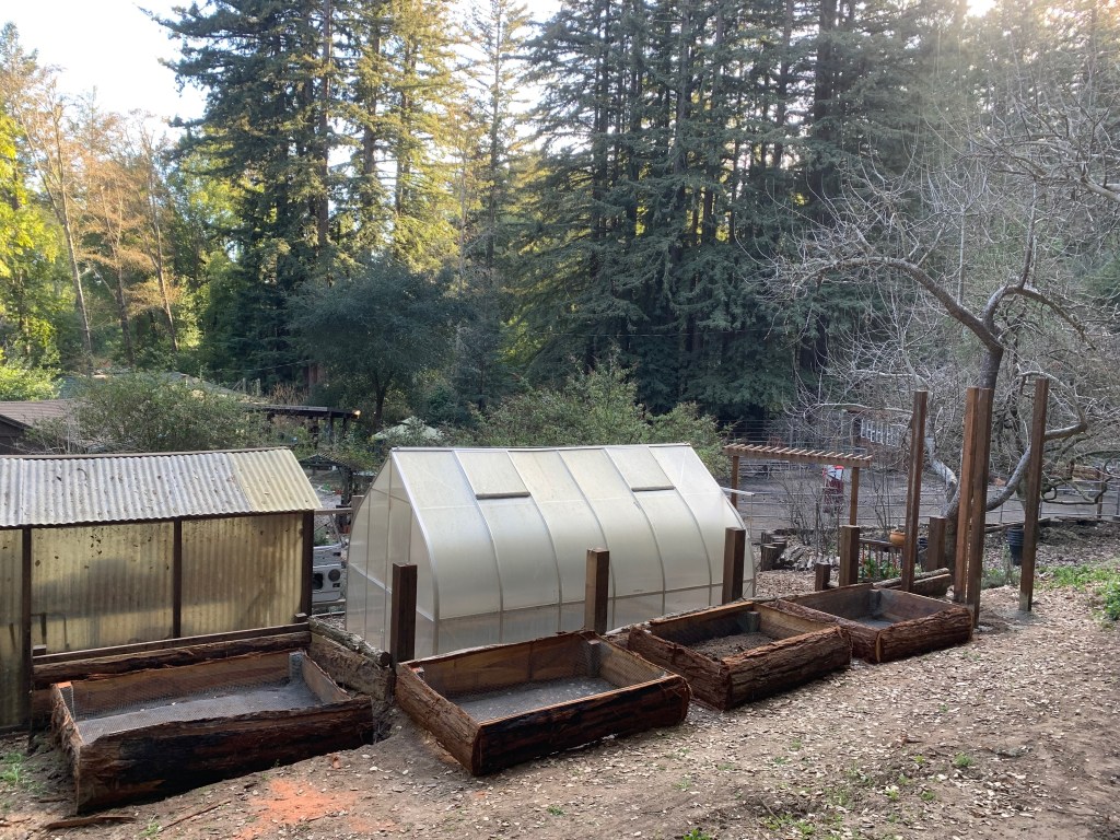 Today, Farmhand Will Burke and I redug the post holes that had filled in since we last used the auger. We cemented in the posts which I “married” together with milled 2×6 redwood. No cost wood.