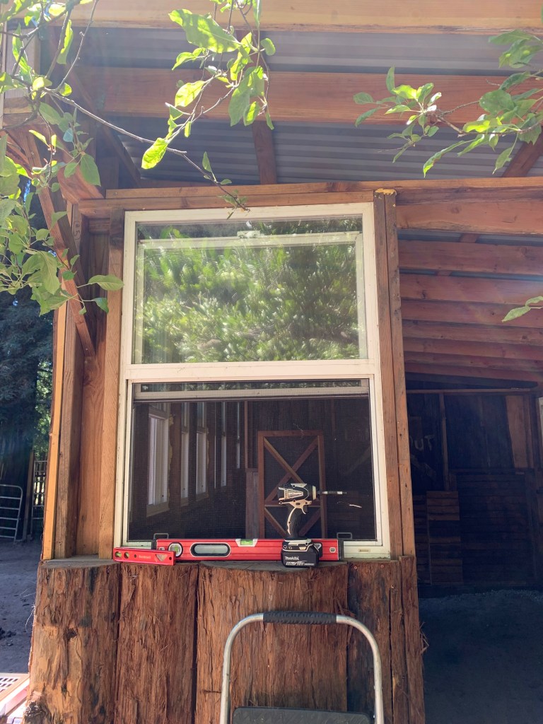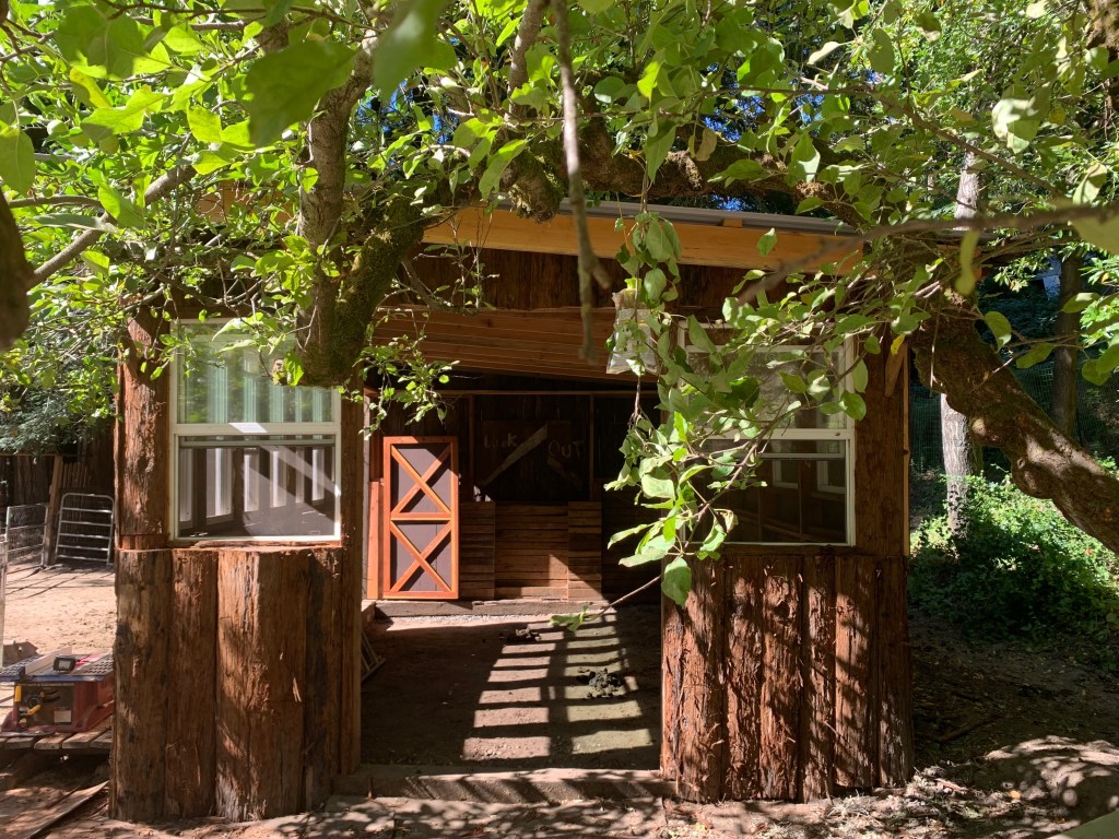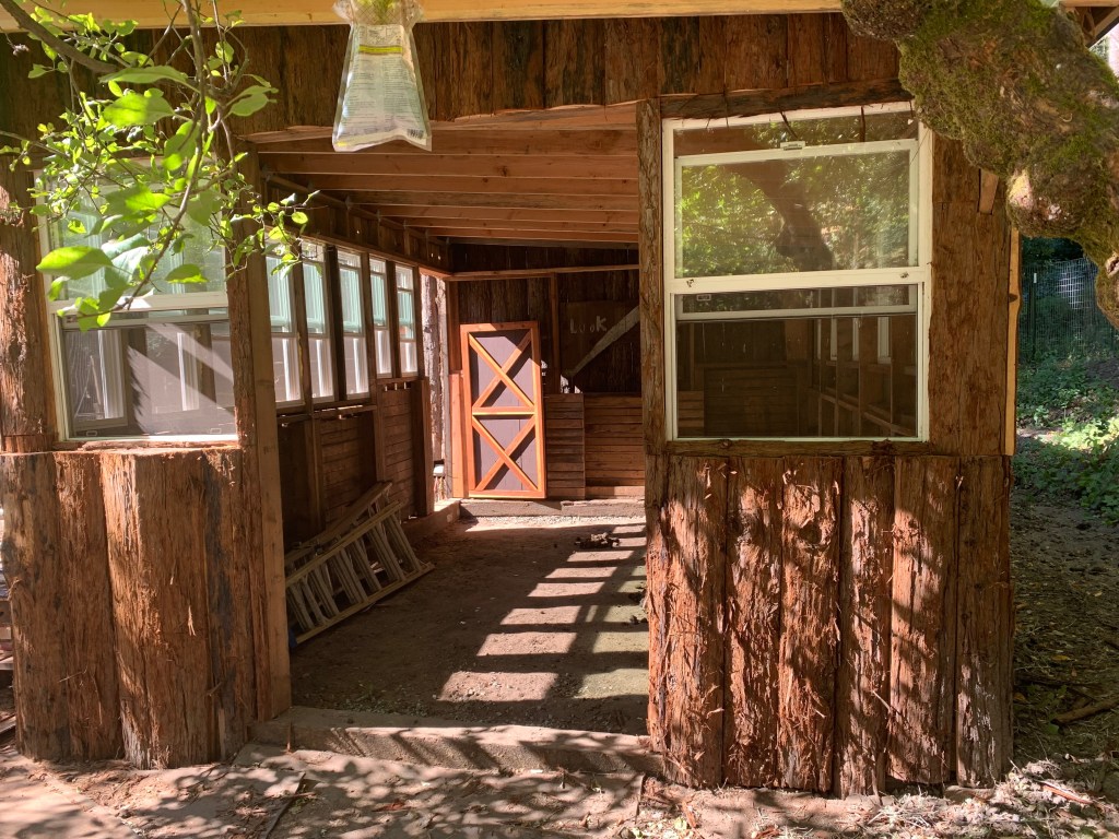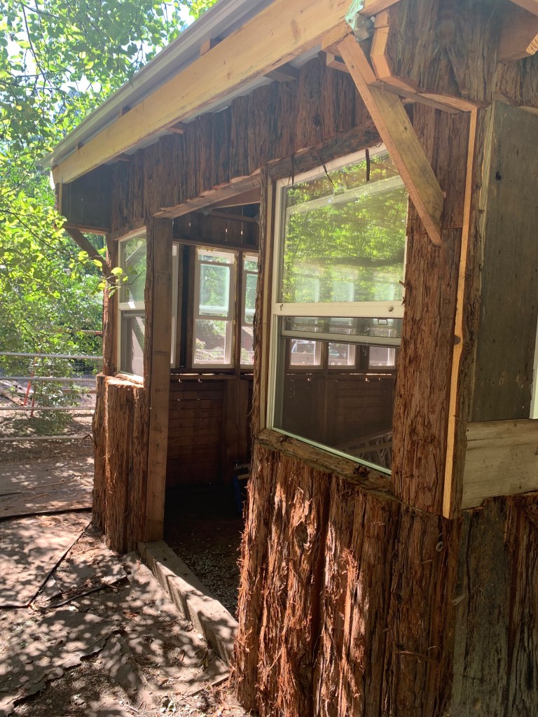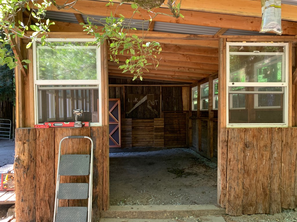 The front of the horse barn is finally done! The entrance is covered with redwood bark slabs.
