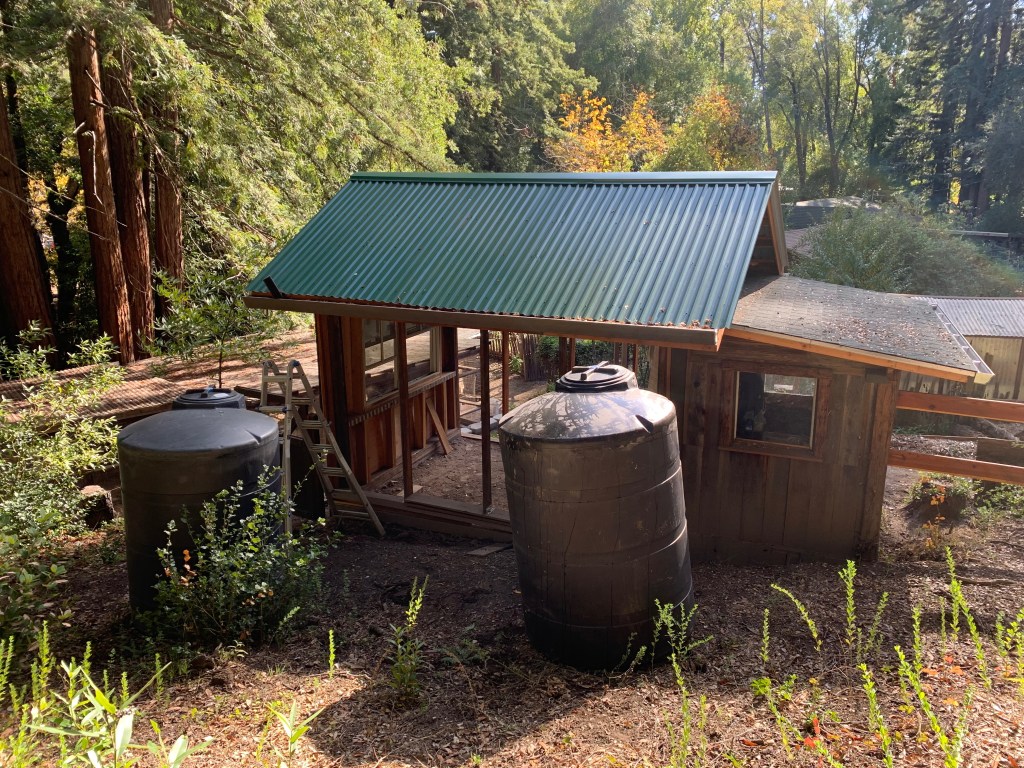 I decided to look for another used water tank and found the perfect one (500 gallons) on Facebook Marketplace. It is black and an exact match to the other one which is green. We picked it up yesterday, and only had to drive 25 minutes to Santa Cruz. The tank is in new condition. What a lucky find!