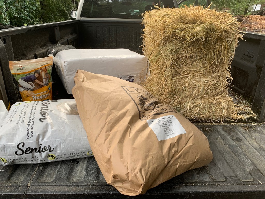 Stocked up on some animal food before the last storm. I decided to get butterscotch cookies for the horses, and rice straw for the chickens as treats.