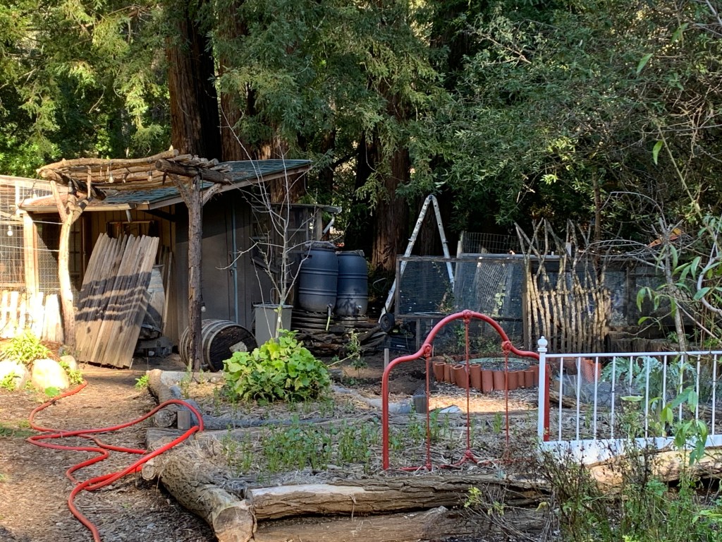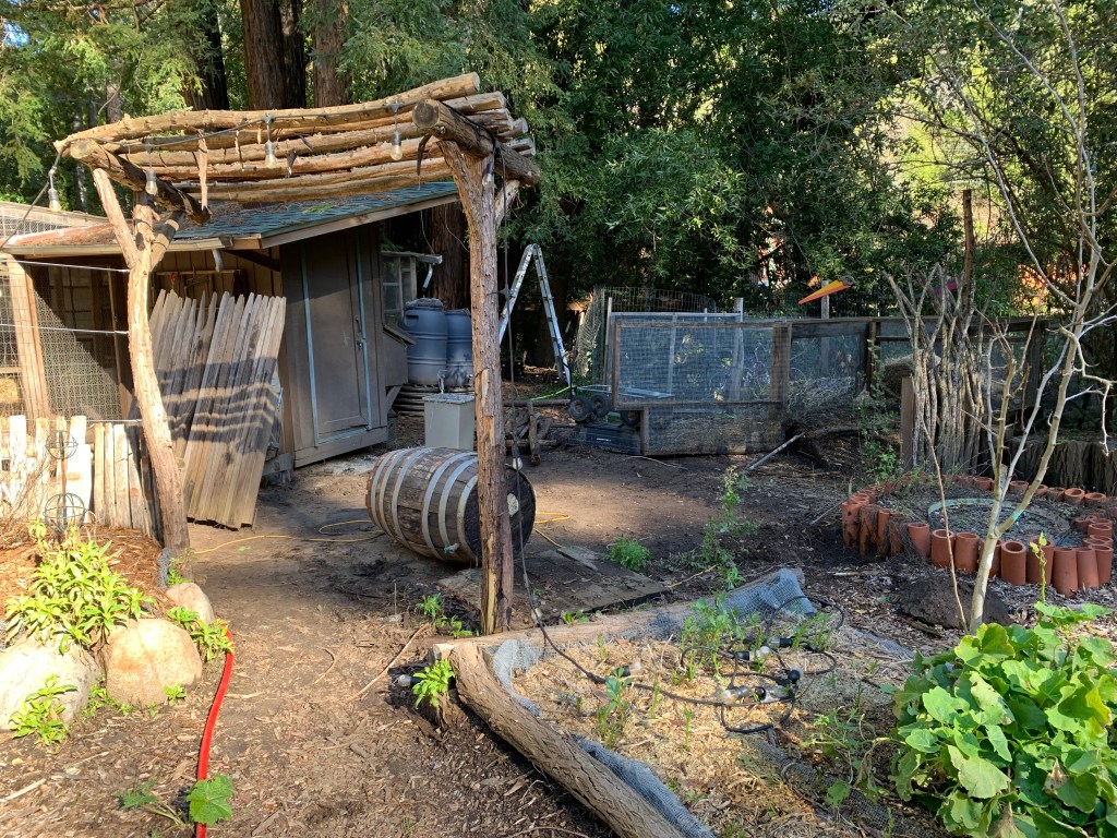 After the winter storms knocked it over, it was time to say goodbye to our redwood branch and wine barrel stave fence. We have enjoyed the funky and natural style for years. I made “spider web” designs with wine barrel rings, old jewelry, and wire. The gates were made with vintage pickets and locust branches. The original concept was to secure it so bobcats could not jump it and get the chickens. However, the chickens just flew over.