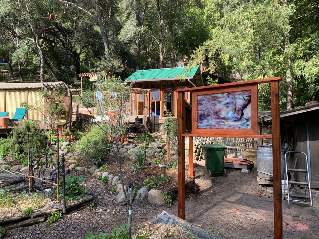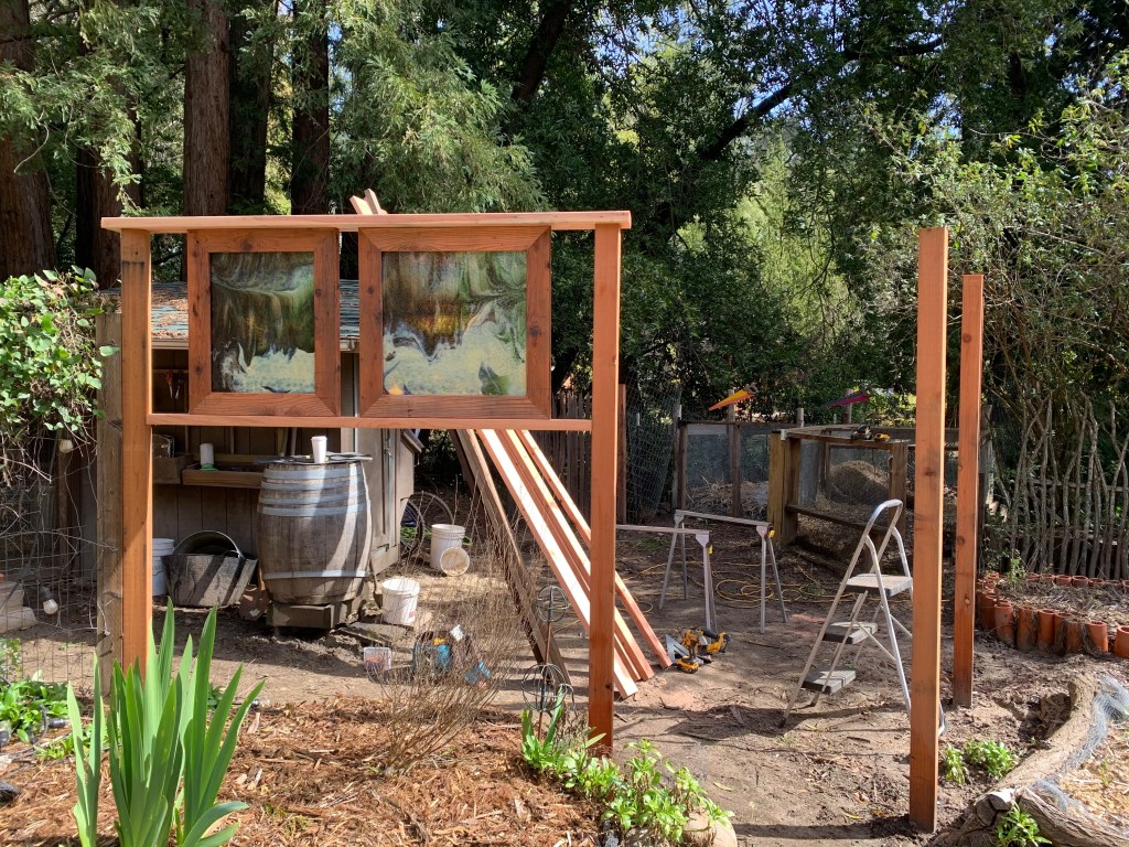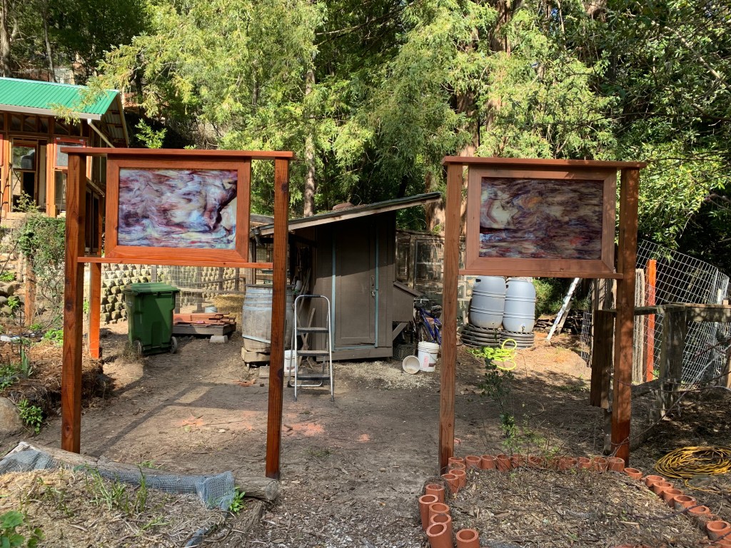 A few days ago, our amazing craftsman, Rich, added the stained glass to the fence. He worked his magic to build solid frames for the glass. We collaborated on the placement and spacing.