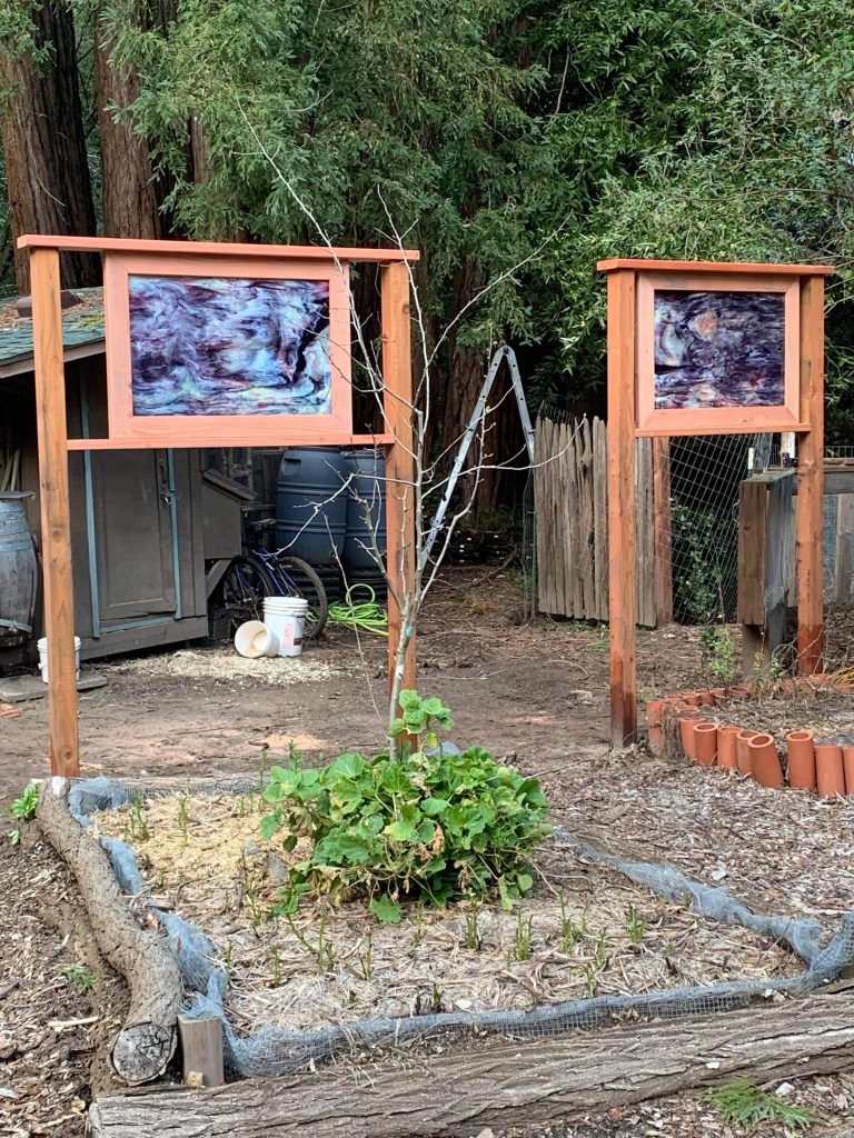 The new fence is designed around stained glass pieces I bought at a local garage sale. They are so beautiful and really need to be showcased.