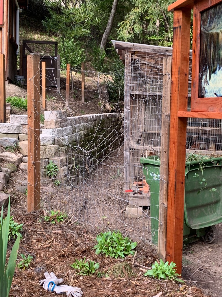 The first step was cementing in 10 ft. redwood 4x4s. I knew that I did not want gates on the fence; easy access and no reason to enclose the space since the chickens stay in their coop.