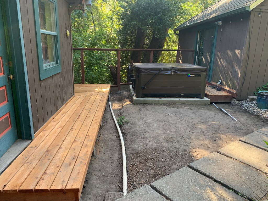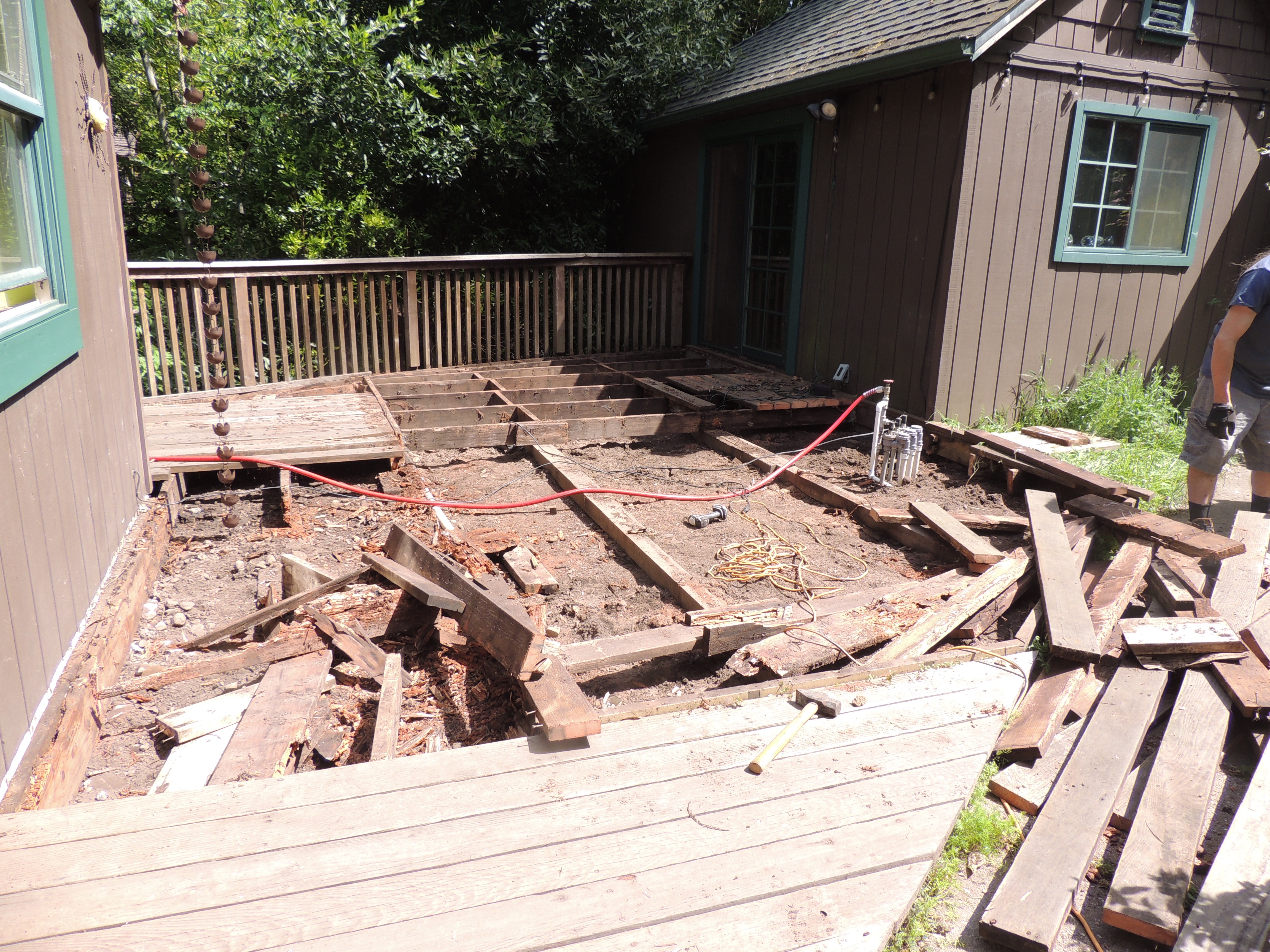It’s been a long process to transform the “sun deck” into a new space. When we first built the deck between the house and garage, we opted for recycled redwood. We got about five years worth of time before it sunk and rotted.