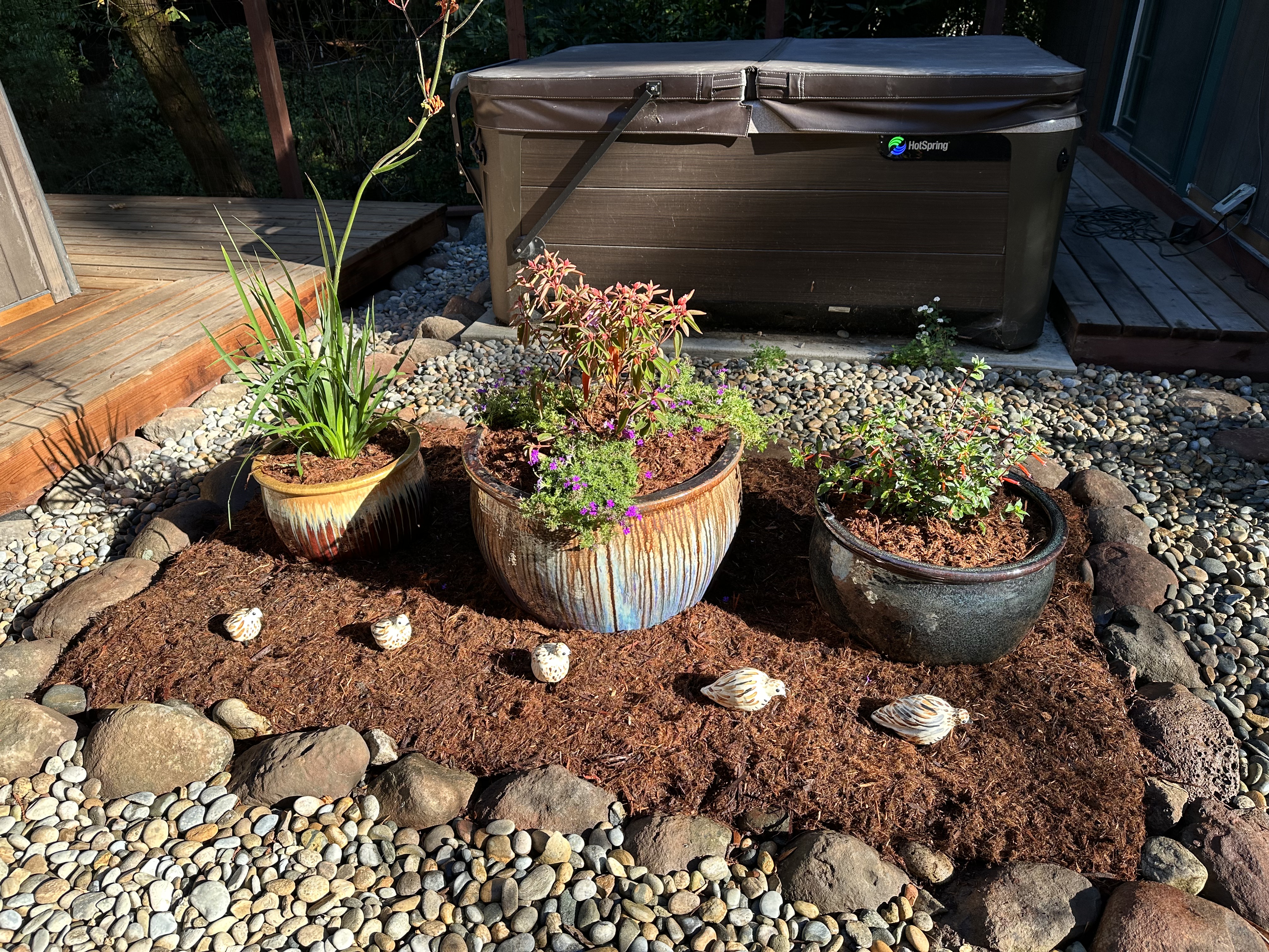 Yesterday, we finally finished the design with new plants, gorilla bark, and our little ceramic quail for a bit of decoration. We love the look and how well it matches the front of the house.