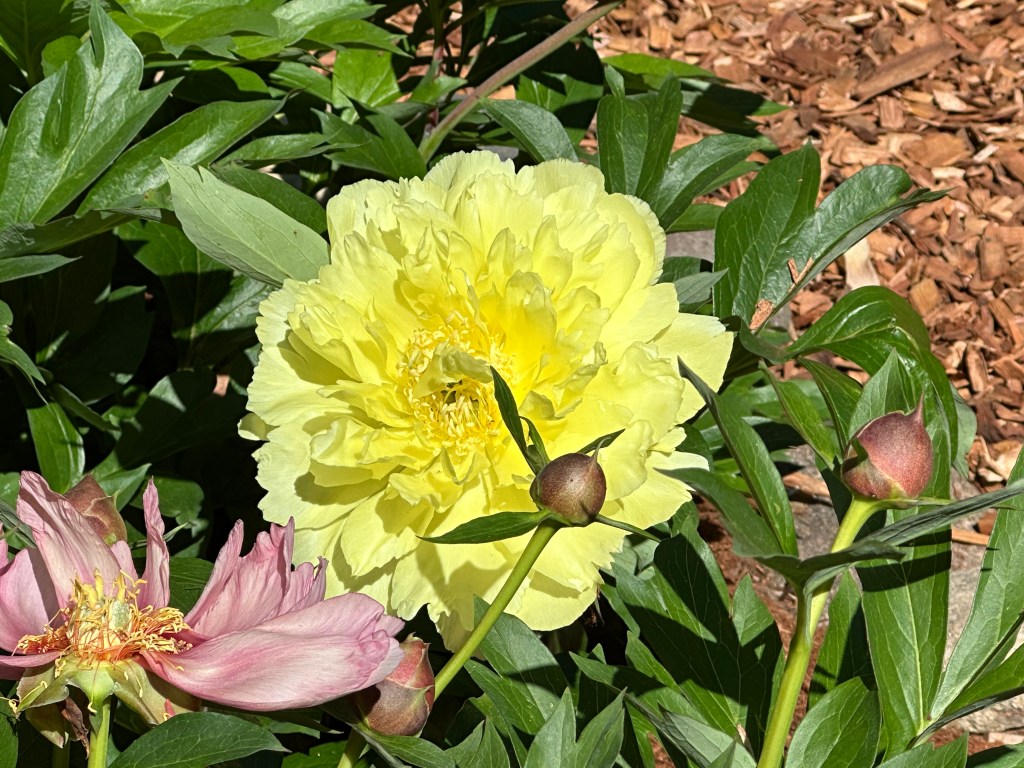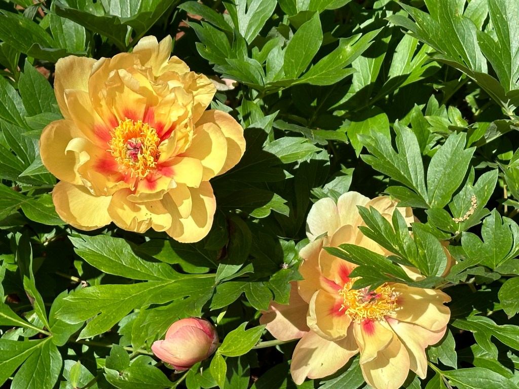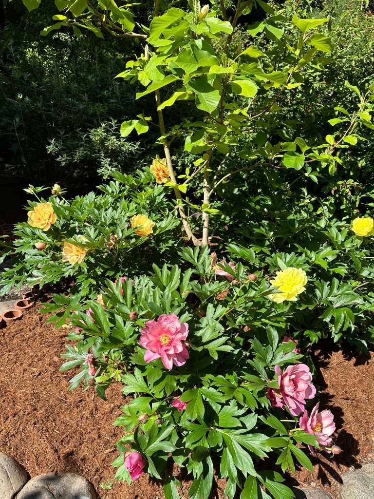 Three different colors of peonies are blooming under the yellow magnolia. So pretty!