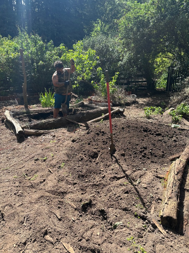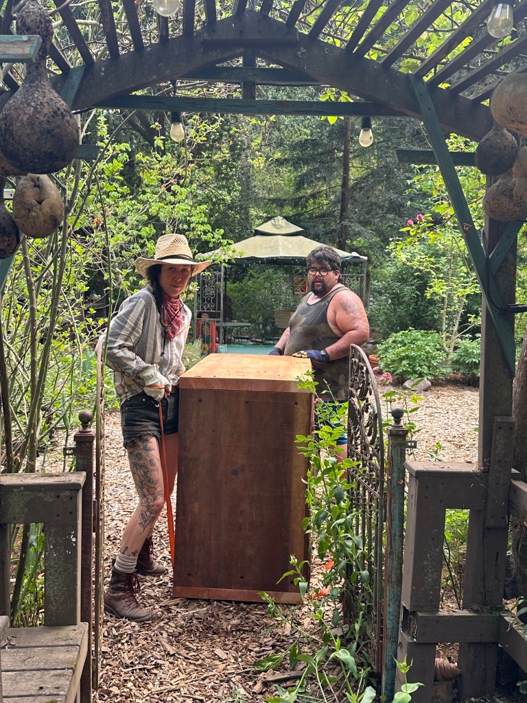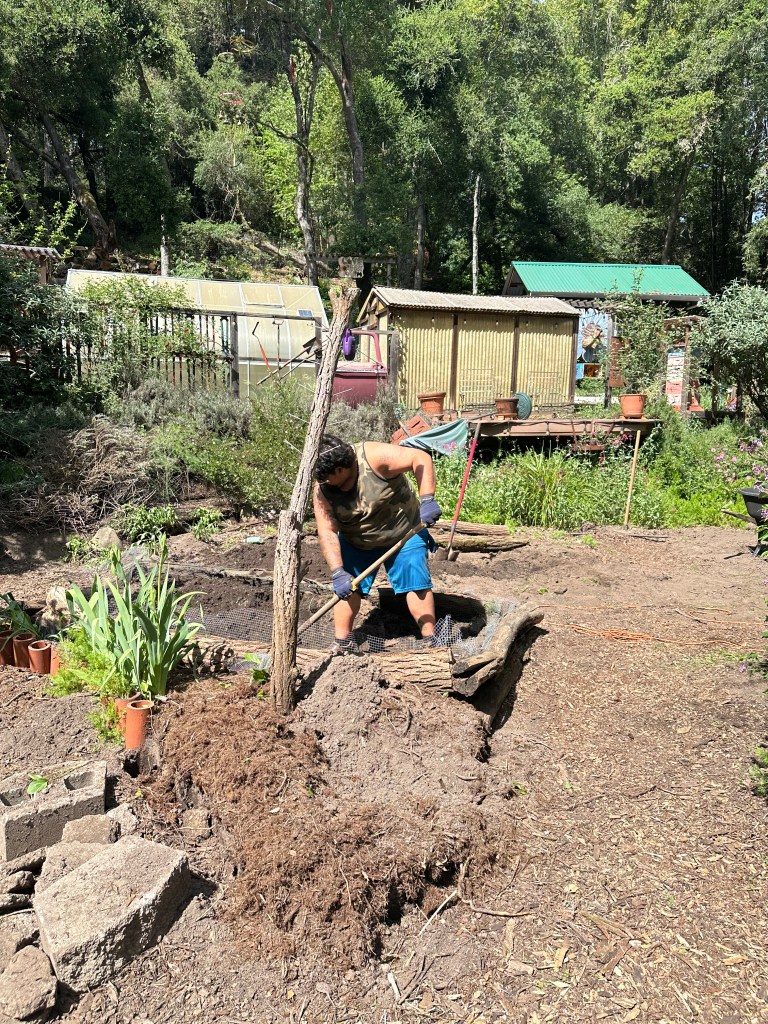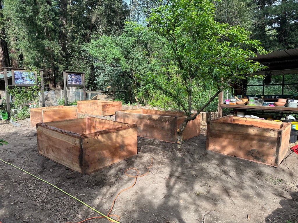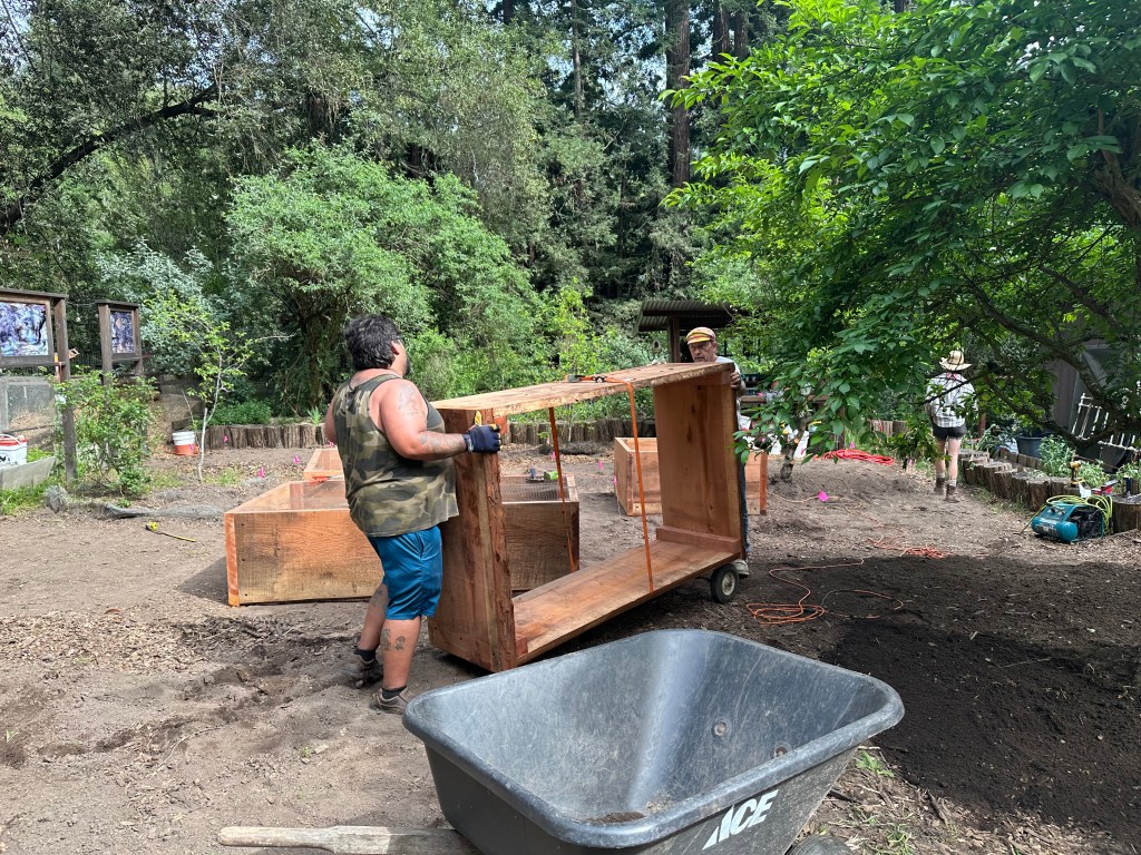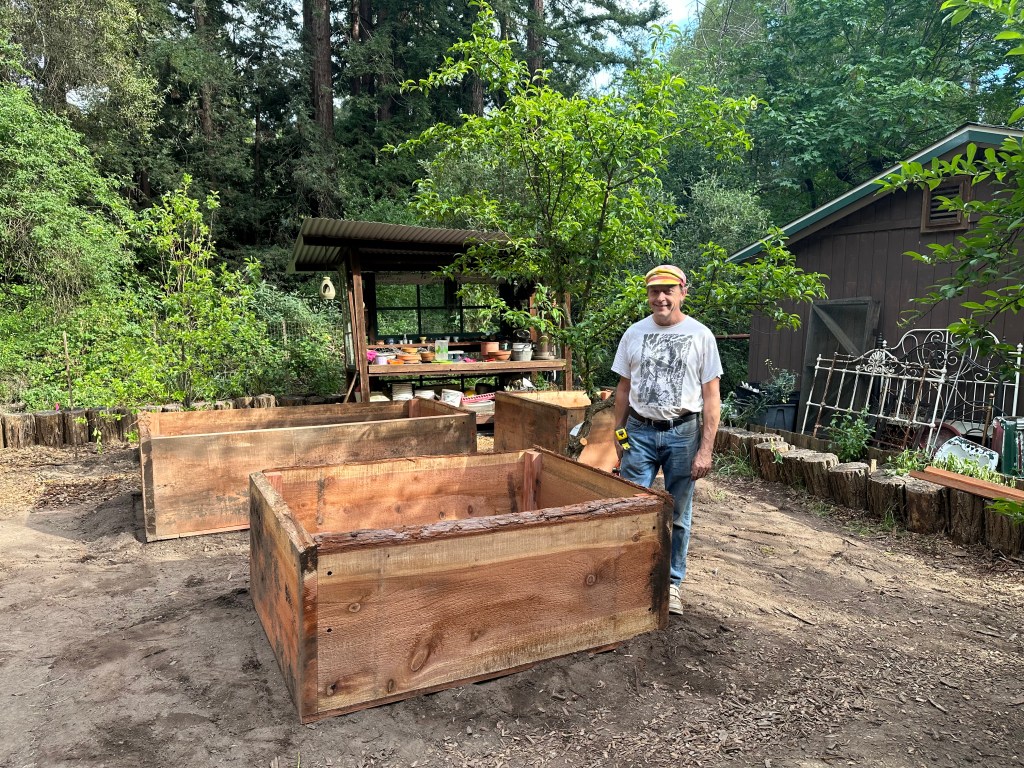 Later in the afternoon, our friend and carpenter Rich came over to install the big redwood planter boxes. The new planter boxes are 2-1/2″ thick and 24″ wide after cutting one edge off. They were about 28-34 inch slabs. The corner blocks are 3″ x 3″ redwood. All screwed together with ledger-lock screws and covered with hardware cloth on the bottom to keep out gophers.
