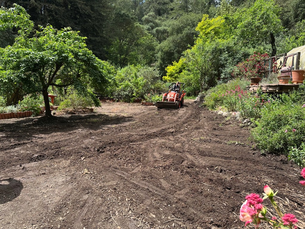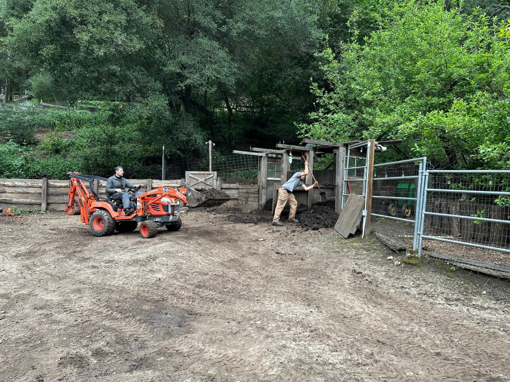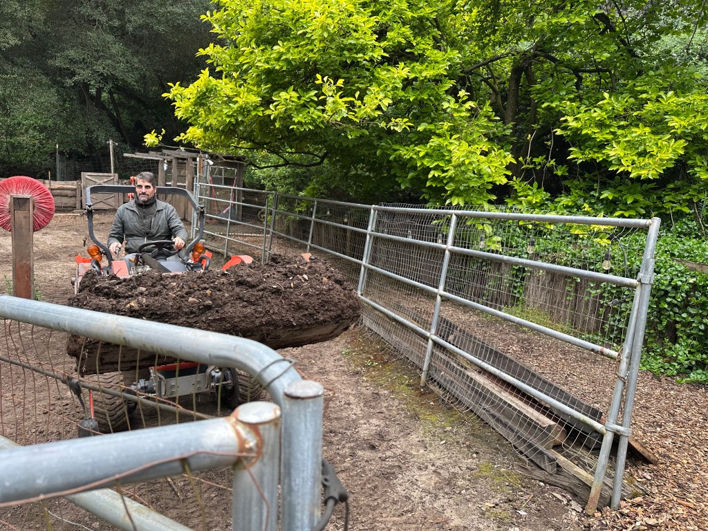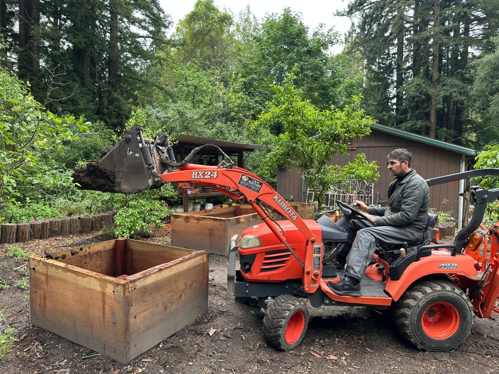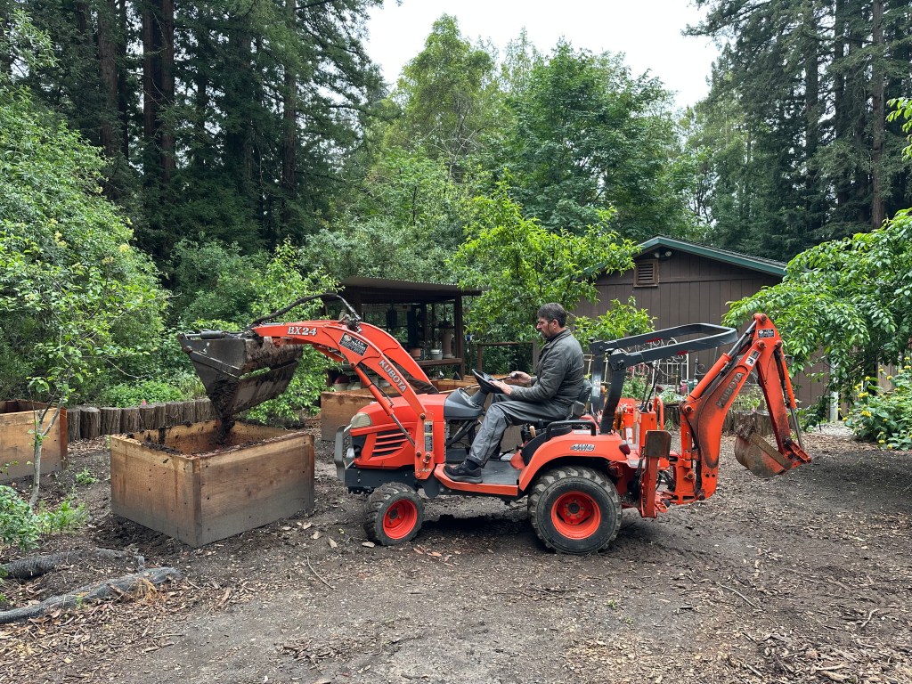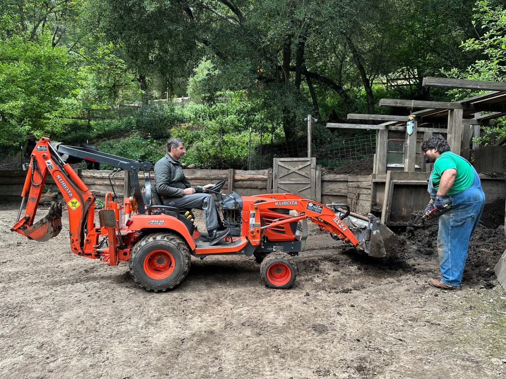 Sunday, April 26, 2026 was a rewarding work day to see the plans come to life. Darren brought over his small Kubota tractor to fill the 5 redwood planter boxes. His tractor worked perfectly to go between the garden and the composting bunker inside the horse corral. We had widened the entrance to 7ft into the garden by removing a gate and fencing and cutting/removing butterfly bushes. I love seeing a plan work out for a positive systems approach. One load of the horse manure in the backhoe is equivalent to 1.5 wheelbarrows. This saves a lot of time and back breaking work.
