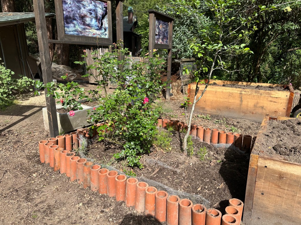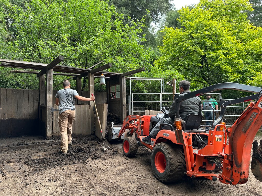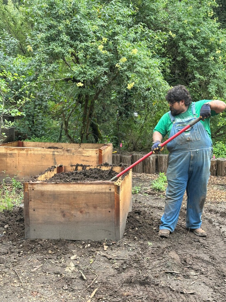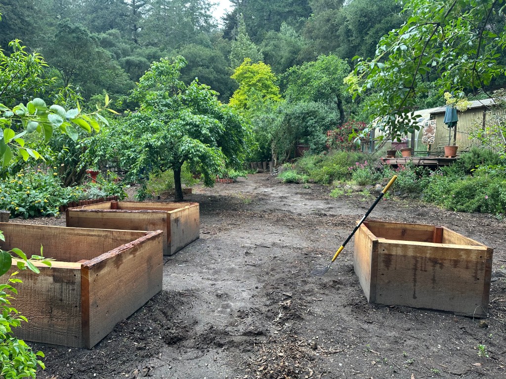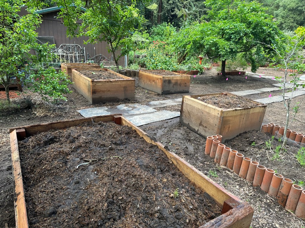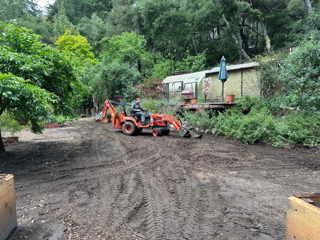 Sunday, April 26, 2026 was a rewarding work day to see the plans come to life. Darren brought over his small Kubota tractor to fill the 5 redwood planter boxes. His tractor worked perfectly to go between the garden and the composting bunker inside the horse corral. We had widened the entrance to 7ft into the garden by removing a gate and fencing and cutting/removing butterfly bushes. I love seeing a plan work out for a positive systems approach. One load of the horse manure in the backhoe is equivalent to 1.5 wheelbarrows. This saves a lot of time and back breaking work.